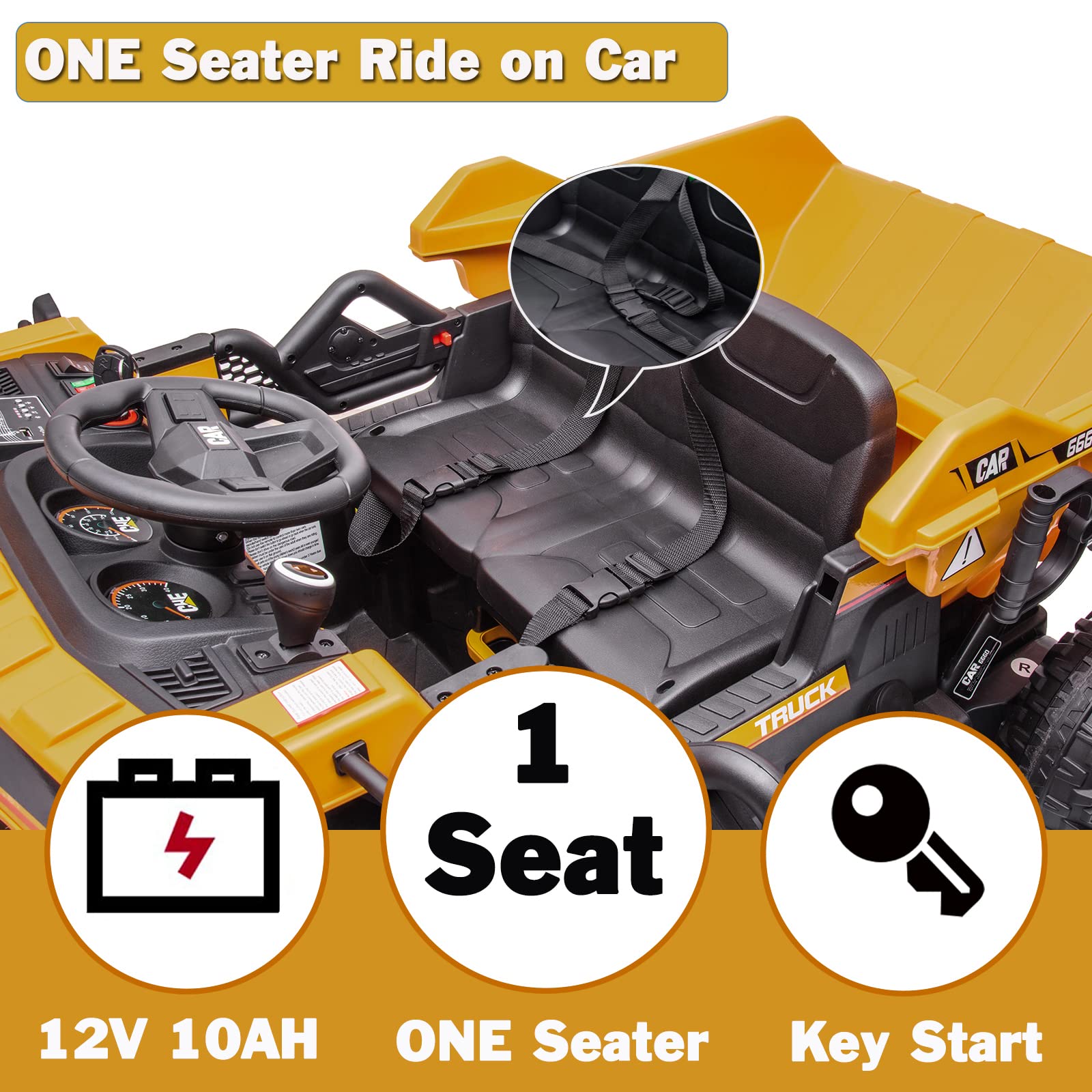 - u3010Width Single Seater Dump Trucku3011This ride on engineering truck equipped with a width seater and came with the a safety belt that can protect kids during driving.18.2" Width Single Seat which provides a spacious space for your kids.