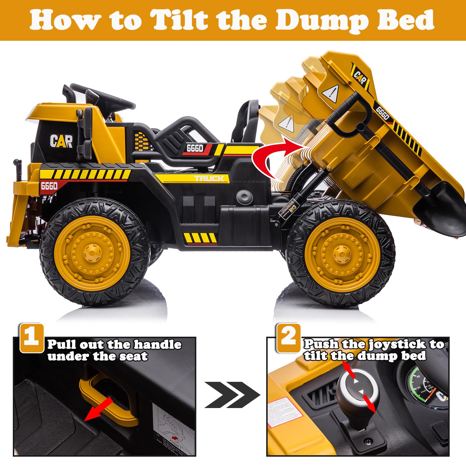 - u3010Automatic Up & Down Dump Bedu3011This dump truck is designed an automatic/electric lifting dump bed. The rear dump bed that will automatically up and down by control the shift knob. (Instruction: Pulling out the handle under the seat and then control the shift.)