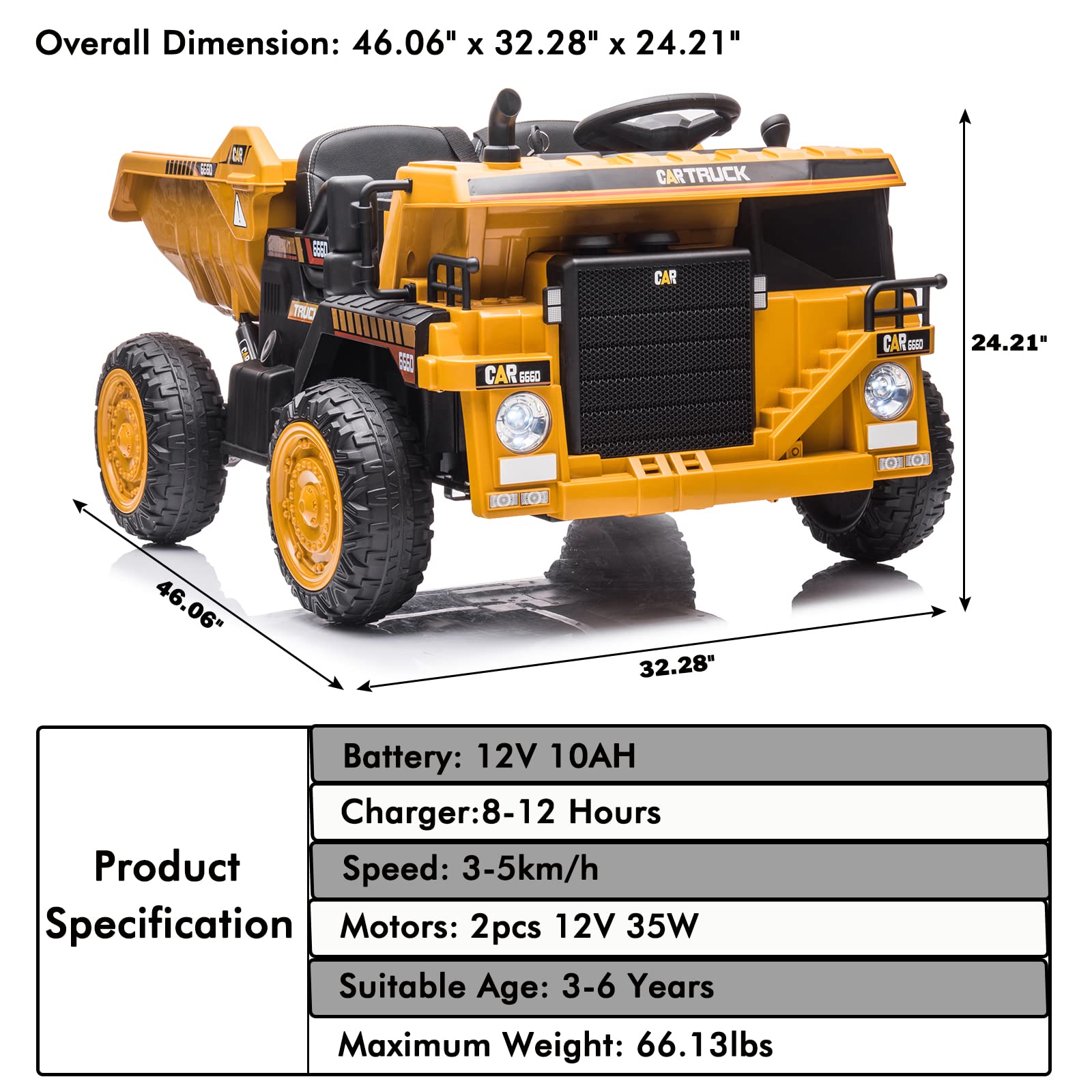 - u3010Perfect Gift for Your Kidsu3011This power ride-on wheel truck is suitable for kids age for 3-6 years.That is absolutely a good choice as a gift for your child on birthday and festival that accompany your childrenu2019s growth, enrich their life and guard their driving dream. Dimensions: 46.06x32.28x24.21inch.