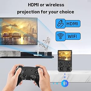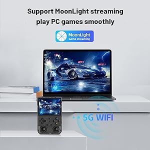 - ud83cudfaeu30105G WIFI &4.2 Bluetooth & HDMI Output & Moonlight streamingu3011Built-in 2.4/5G WIFI 802.11a/b/g/n/ac , New generation of 5G WIFI technology , support 2 hosts to play online at the same time . Bluetooth 4.2 can connect gamepad , headset . Support Moonlight streaming that can play PC games smoothly . Dual 360-degree operation is really cool let the market Most portable game consoles on the market are prohibitive. Wow, this is crazy, this is a must-have item for kids, a wonderful retro game console.