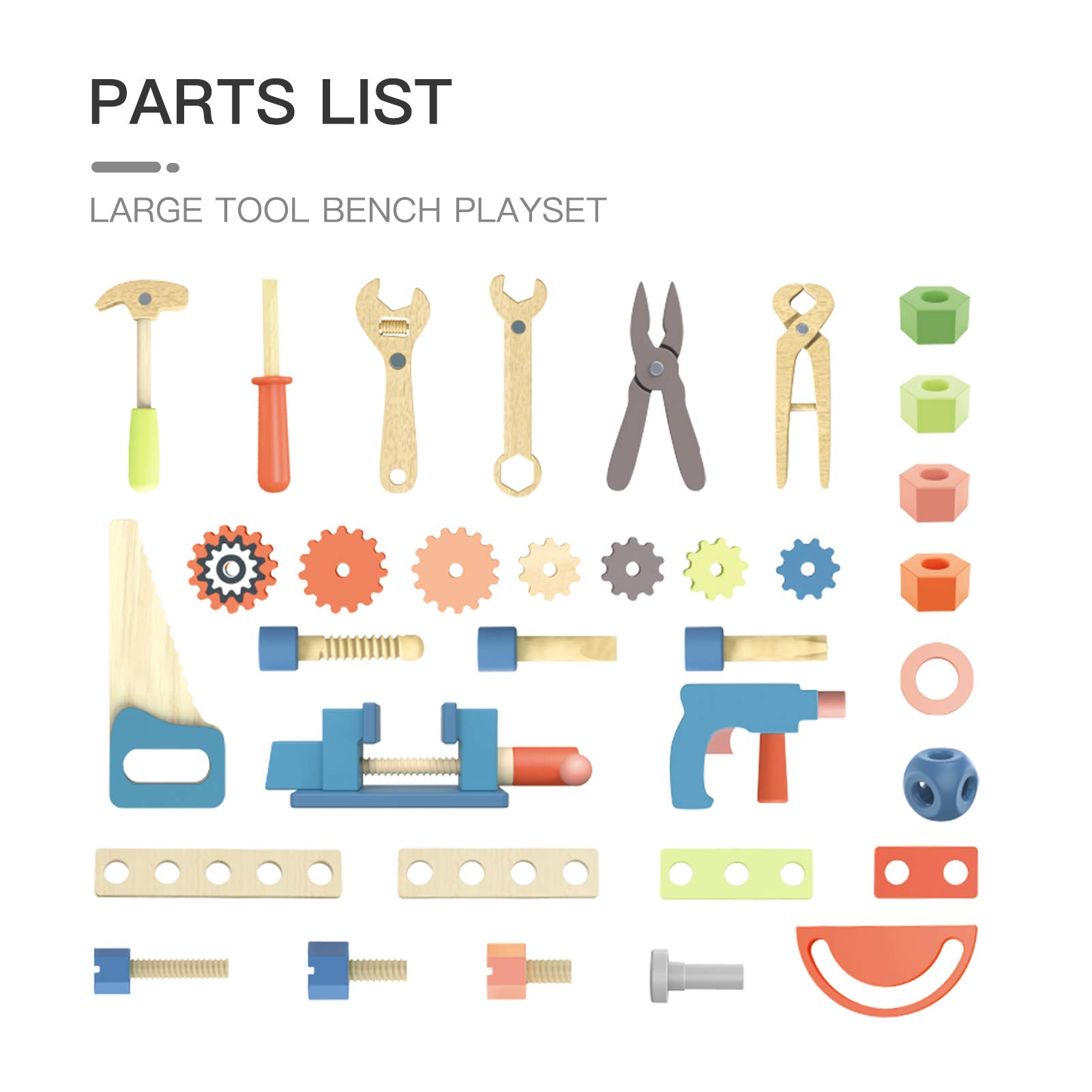 - [ Rich in Color ] - This wooden workbench all parts colour is bright, More attractive to toddlers. Multiple simulation wooden tools are designed for children to enhance the authenticity and let children give full play to their creativity. Include, wooden toy wrench, saw, hammer, screwdriver, screw