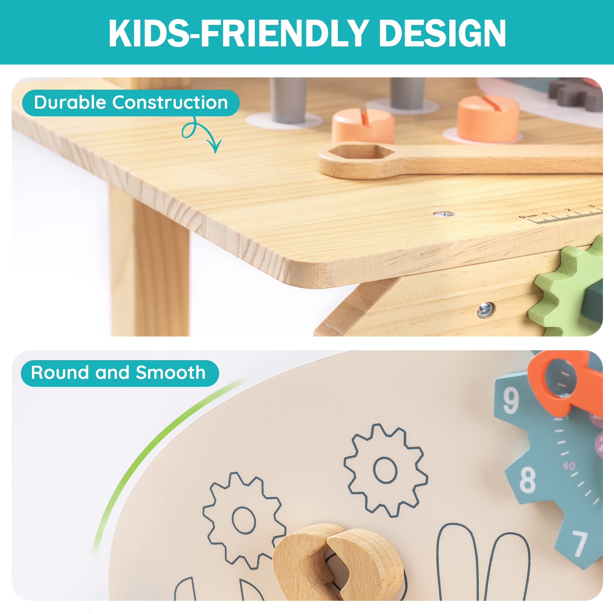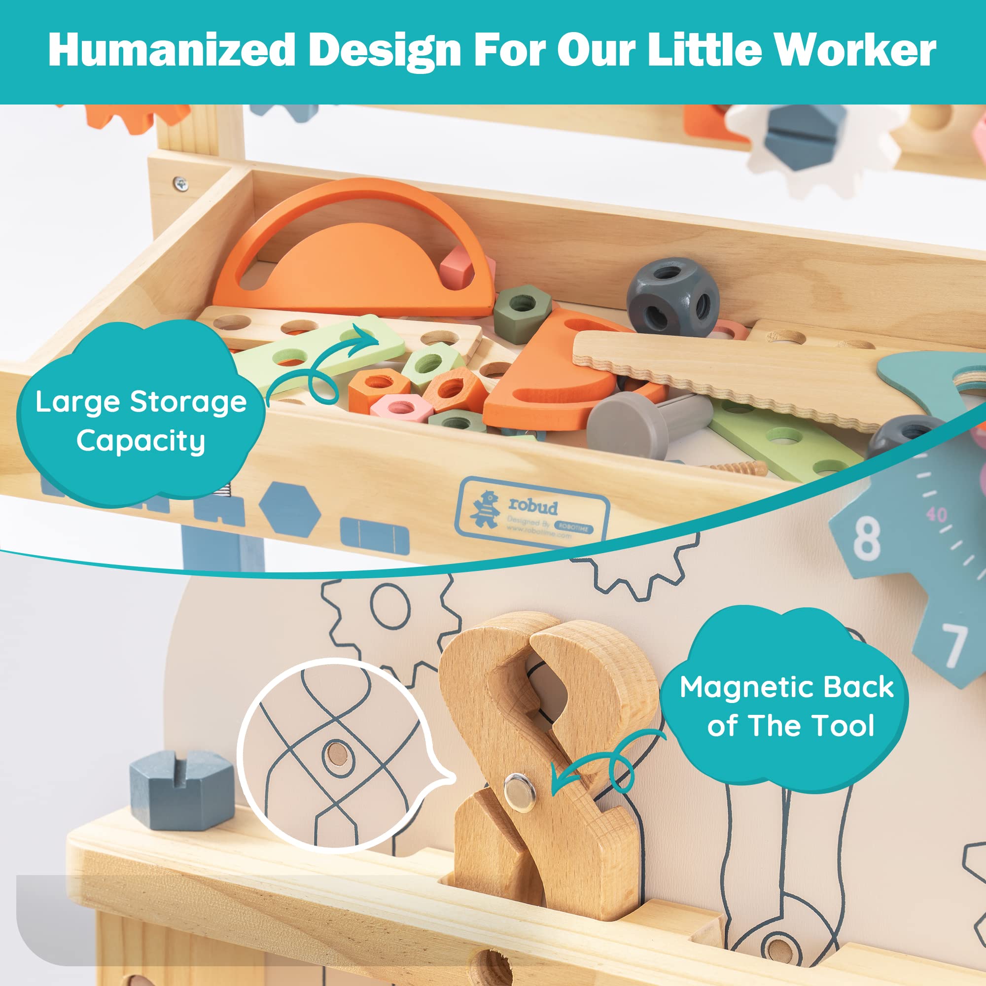 - [ Safety & Nature ] - Robud Workbench made of solid wood, sturdy and durable construction, The surface is smooth without burr, All edge rounded corner design, So your toddlers won't get hurt on this Tool Stand toy