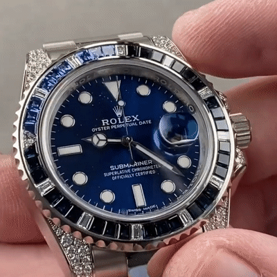 This is an 18K white gold Rolex Submariner 116659SABR. t includes an integral Rolex 18K white gold Oysterlock bracelet with a folding deployment clasp and a scratch resistant sapphire crystal. It has a screwed down solid case back and Triplock winding crown protected by diamond set crown guards. The solid three-body 40 mm. diameter case, straight diamond set lugs, bracelet and flat knurled bezel, are polished and brushed. The graduated unidirectional revolving bezel is white gold and set with 27 b aguette cut sapphires, and 11 baguette cut diamonds every 10 minutes, the dive triangle at the 60-minute position is set with a triangular diamond. It has a sunburst blue dial with luminous white gold-set dot, baton, and arrow hour index markers, luminous white gold 'Mercedes' style Rolex minute and hour hands, a center sweep second hand with a luminous 'lollipop' indicator, a white minute/second perimeter chapter ring, and a cyclops magnification lens for the date aperture window at 3 o'clock. It's water resistant to 330 meter/1,000 feet, it has a 48-hour power reserve at full winding, and the 13mm thick case, dial, and movement are all signed.