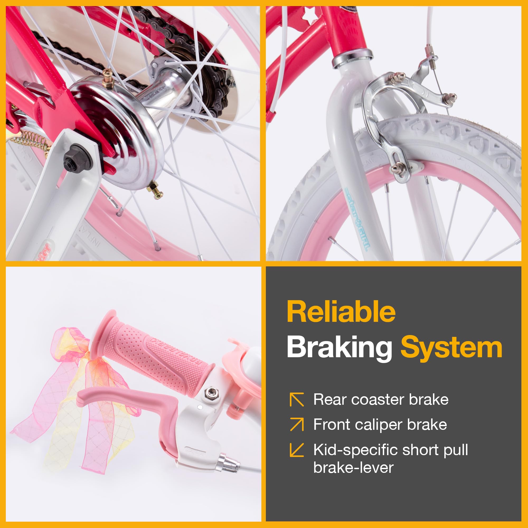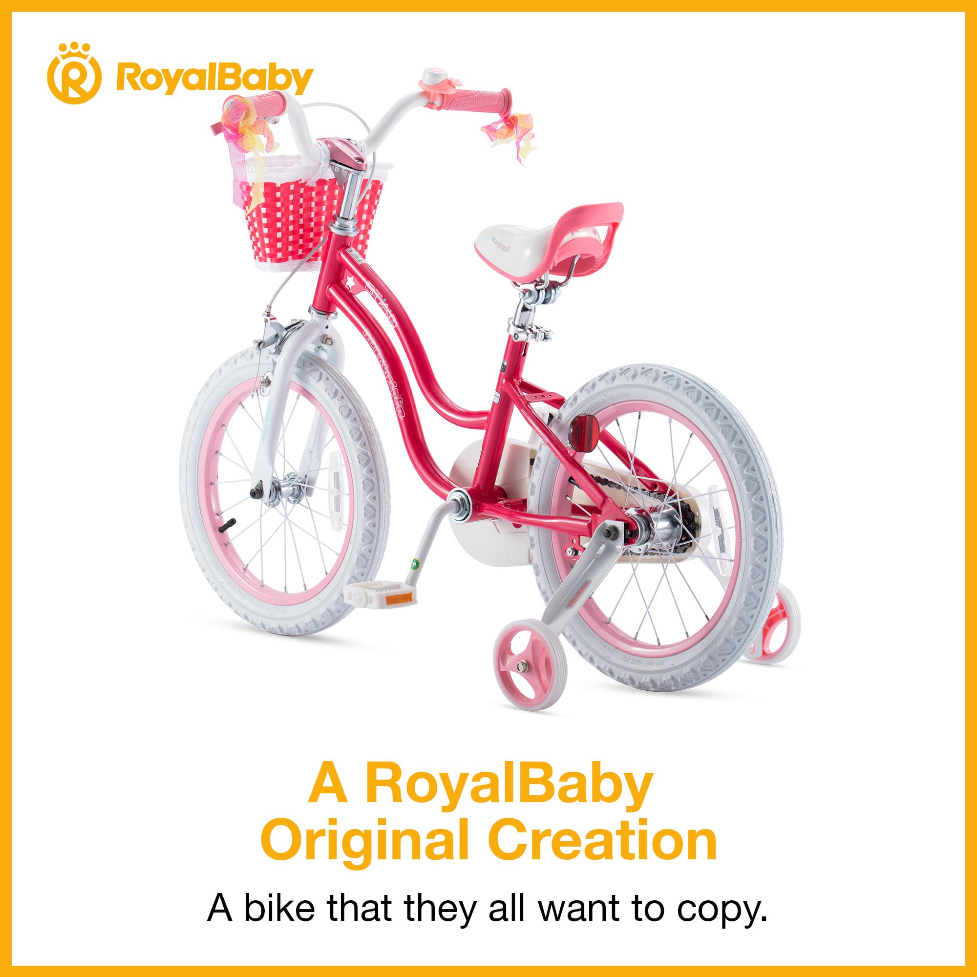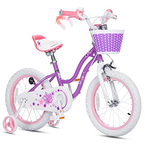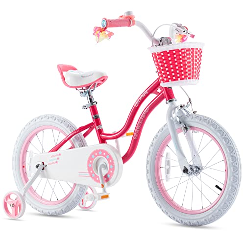 - u2b50SPECIFICALLY FOR GIRLS u2013 Royalbaby girls bike has a low geometry delicate curve frame, easy for kids to hop on. Cute bike in lovely colors and details, dual brakes (pedal and hand), detachable height-adjustable wider training wheels for excellent steadiness, a bell, and a basket for her dolls. It's a great first bike with all the bells and whistles a child will need to learn and get comfortable with biking.