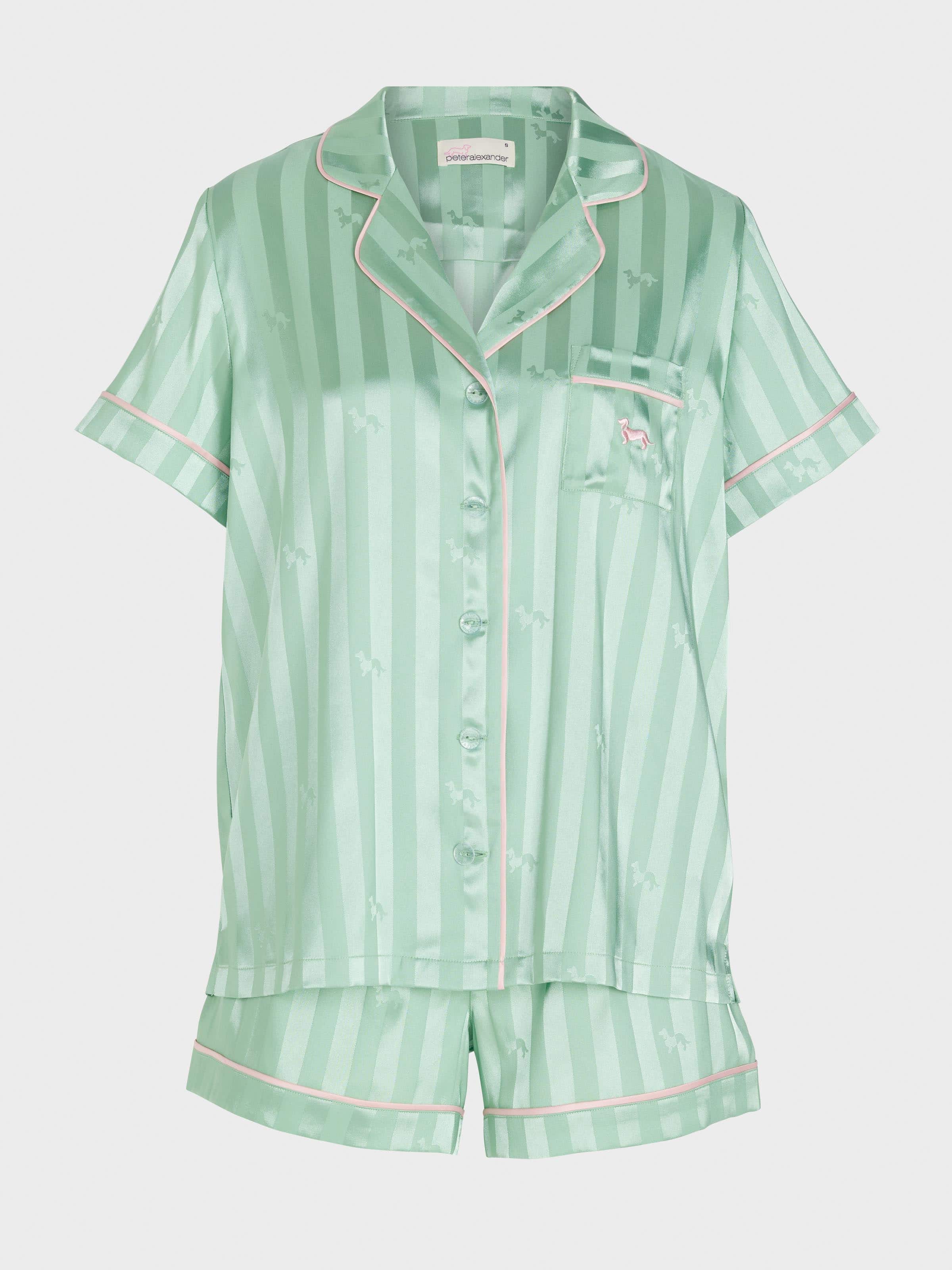 Our best selling satin pyjama set is now available in an irresistible new sage green colour. This new shade has all of your favourite features, including a soft self-stripe effect with mini penny dogs all over, making it a P.A. exclusive product.? Pink trims and a matching gift box add the extra special touch to produce the perfect gift for any woman, including yourself.?