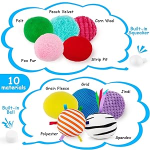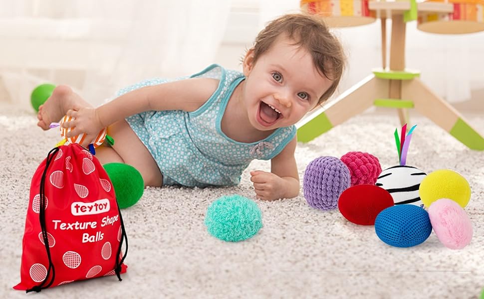 - [WONDERFUL SENSORY TOY FOR BABIES]:teytoy sensory ball set is made of 10 different textured sensory fabrics. Each of them can let the baby feel different textures in the process of touching and playing, and help the baby to establish a preliminary understanding of the world.