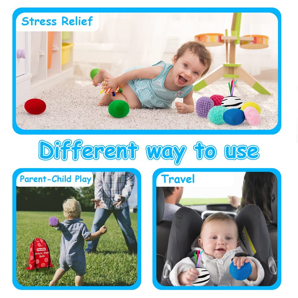 - [FABULOUS TRAVEL TOY]:teytoy textured sensory balls come with an easy-to-organize drawstring pocket, making them very convenient to carry when you and your baby need to travel long distances. And in the process of traveling, put it in the back seat of the car to accompany the baby's journey help handle boredom.