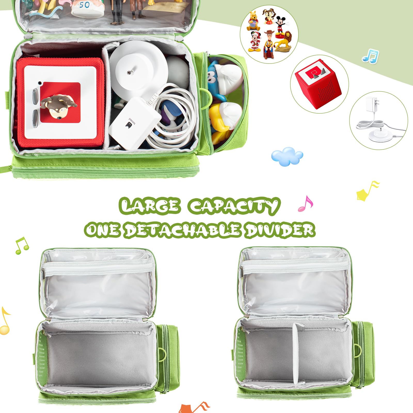 - u3010ud83cudfa7EVERYTHING IN ONE PLACE AND ORGANIZED u3011 Well-made Tonie case! Toniebox, 15-20 Tonie Characters, headphones, and charging stations can all be kept in one place and organized. The main compartment includes a removable divider, keeping your tone box secure and safe.