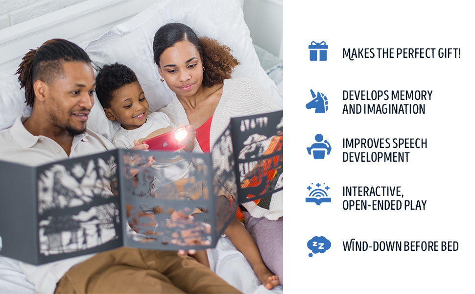 - FAMILY-FRIENDLY: Bring everyone together for a fun-filled game night. Hold the book or place it on your bed, then dim the lights and turn on your phone's light. The shadow theater is perfect for family gatherings and children's parties, and when extra characters are added, the game becomes even more engaging. You'll find a short version of the tale inside the box, as well as a QR code for the full audio version of the story.