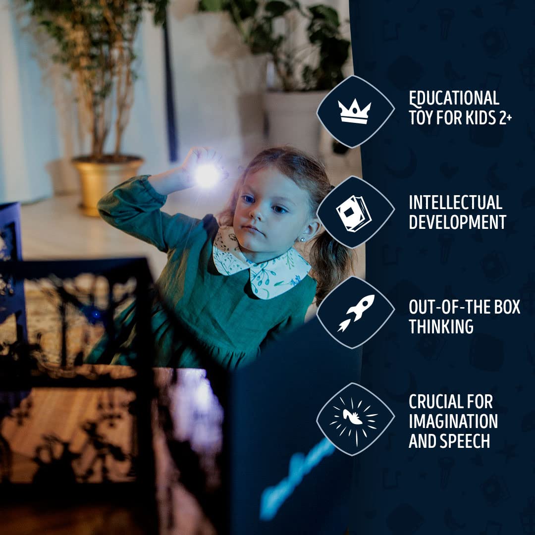 - FAMILY-FRIENDLY: Bring everyone together for a fun-filled game night. Hold the book or place it on your bed, then dim the lights and turn on your phone's light. The shadow theater is perfect for family gatherings and children's parties, and when extra characters are added, the game becomes even more engaging. You'll find a short version of the tale inside the box, as well as a QR code for the full audio version of the story.