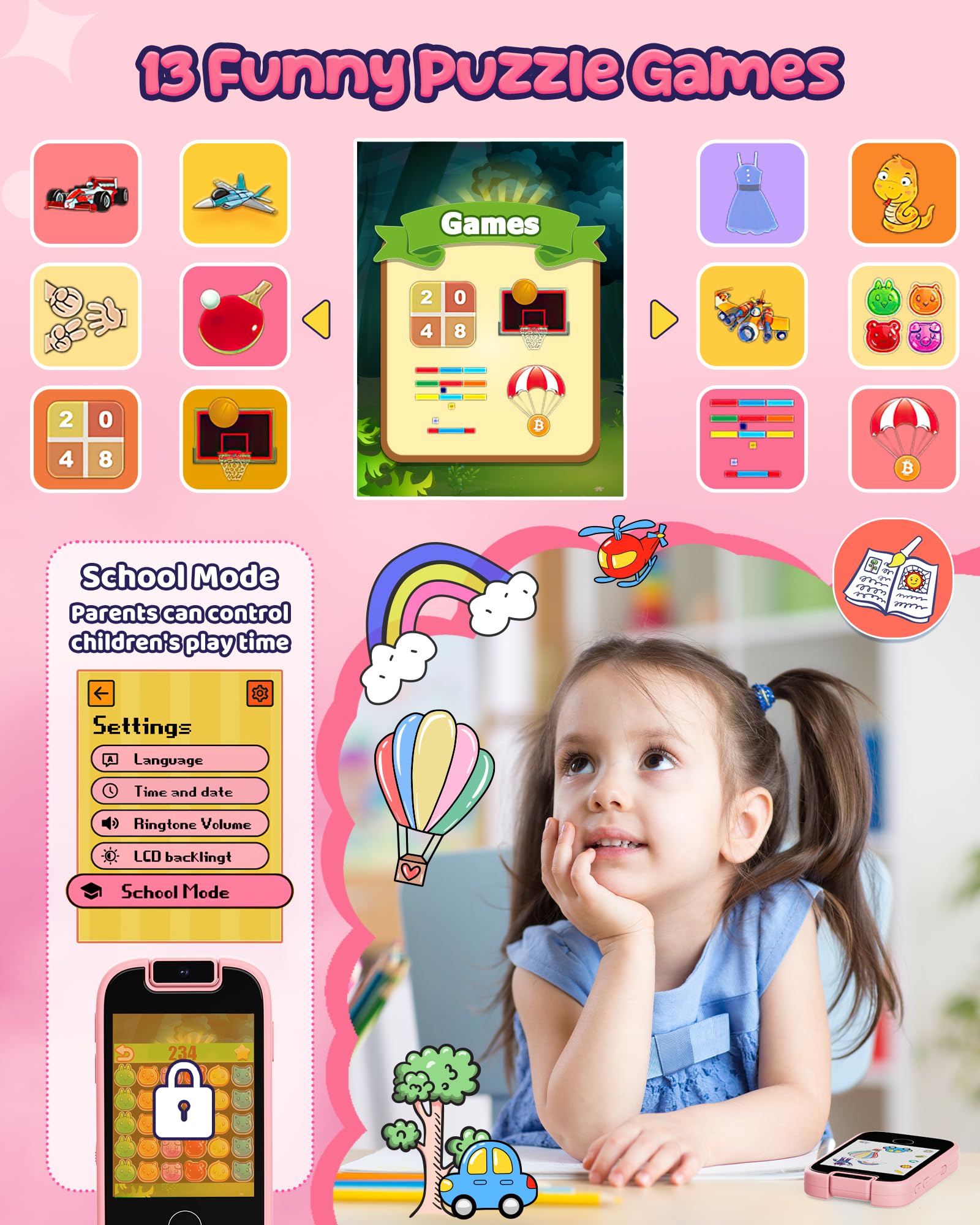 - Thoughtful Gadgets --Girls' toy phones include a built-in flashlight for exploration, a timer for time management, and a calculator for calculation. In addition, the habit recorder can remind children to get up, study, eat, do activities, etc., so that children can develop habits, improve self-discipline and focus, let children know the priorities that should be finished first, know the priorities of things, will not feel overwhelmed because of too many things, and improve children's logic.