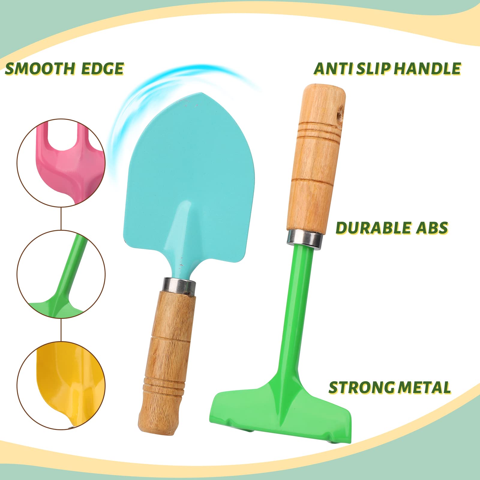 - ERGONOMIC DESIGN FOR CHILDREN: The handle of our long tools is provided with a hanging hole for easy hanging and storage. And the length of the long tool, 7 inch , is a regular size, suitable for most children.Let them fall in love with the joy of gardening.