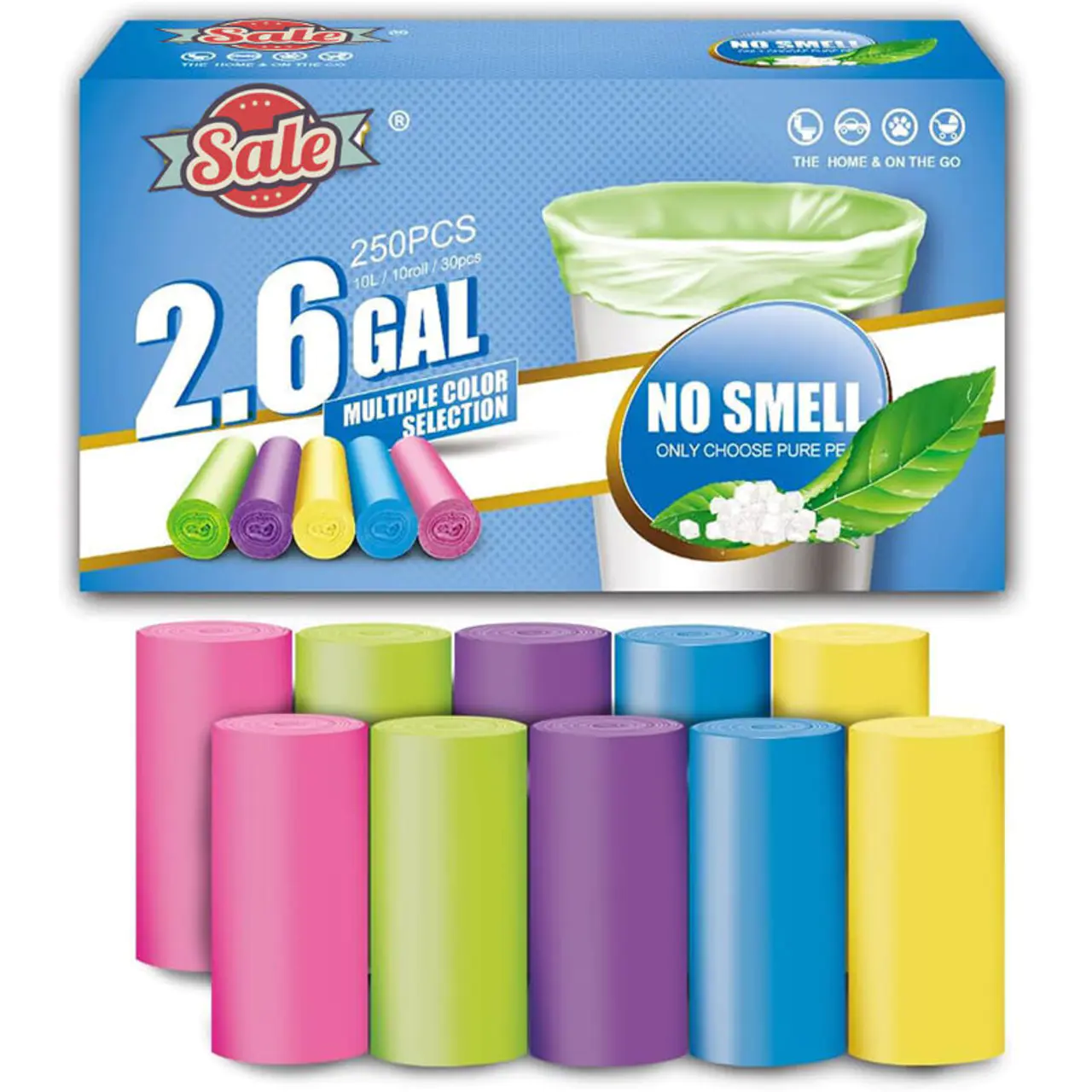 - 【Multi-Color Choice & Roll Design】 There are 5 colors of our small 2.6 gallon garbage bags, include Blue, Green, Pink, Yellow and Purple. They arrive in a neat roll with nice package box, perfect for storage.