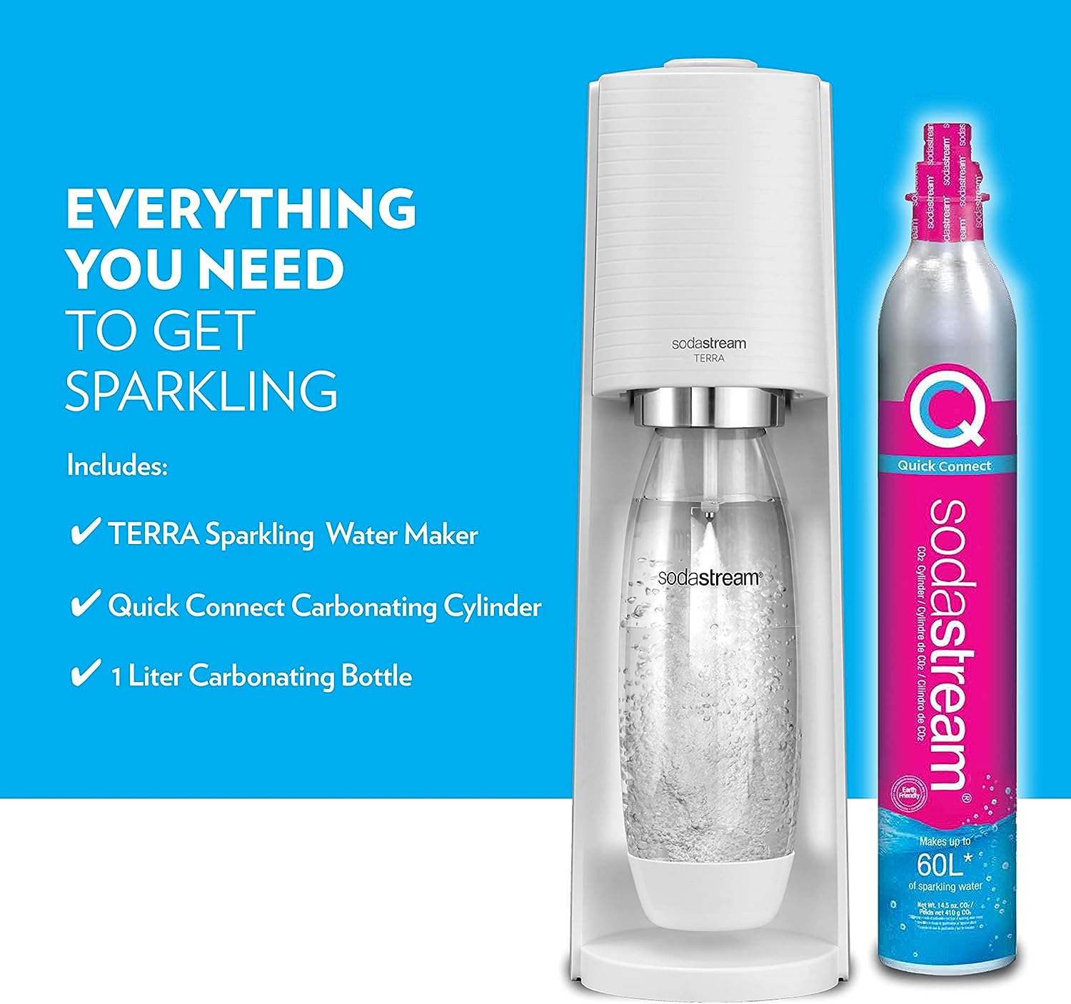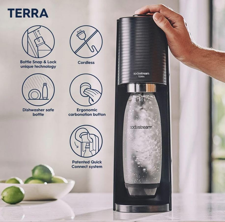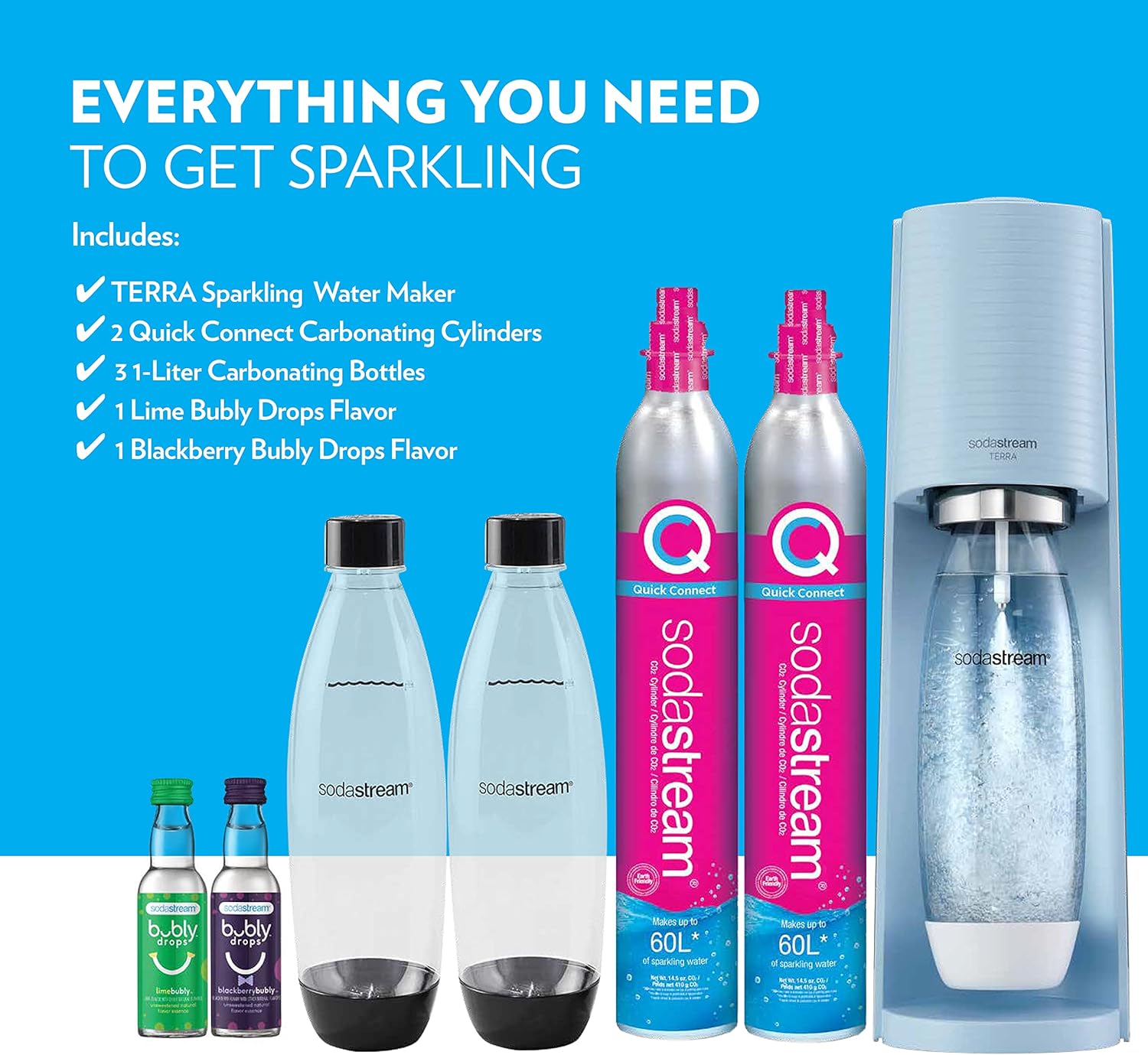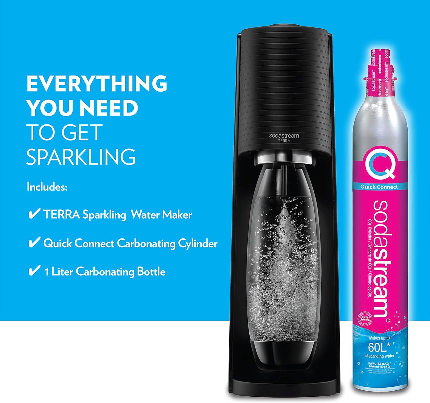 SodaStream Terra Sparkling Water Maker Bundle (Black), with CO2, DWS Bottles, and Bubly Drops Flavors