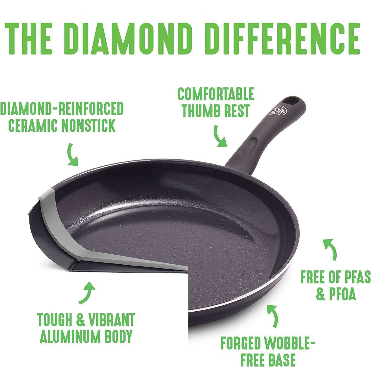 - Tough, diamond-reinforced nonstick coating ensures incredible durability