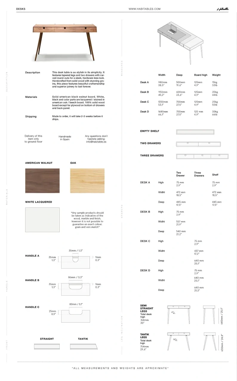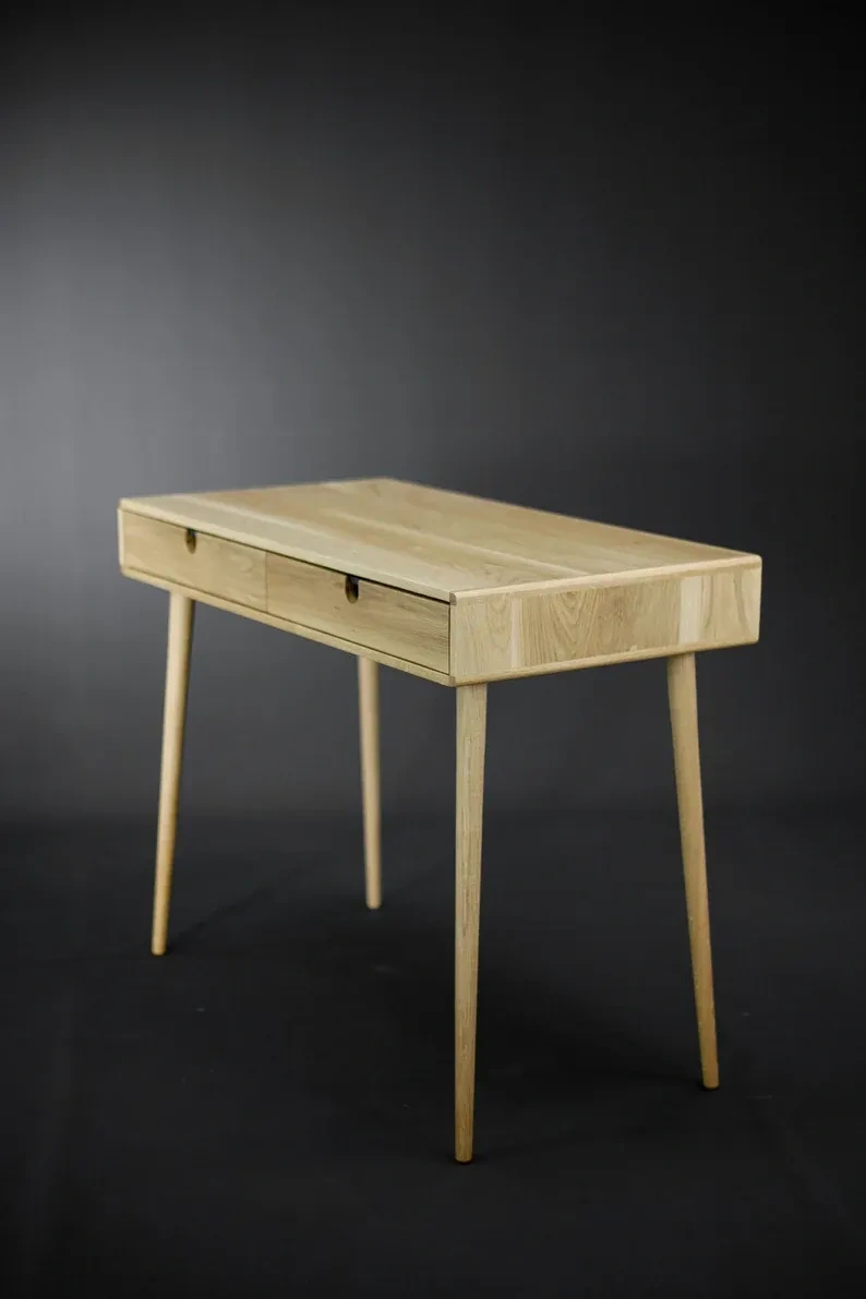 This desk table is so stylish in its simplicity. It features tapered legs and two drawers with carved round-outs for a sleek, hardware-less look. Handcrafted from solid wood with stunning grains, this piece features beautiful craftsmanship and superior joinery to last forever. Handmade in Spain.