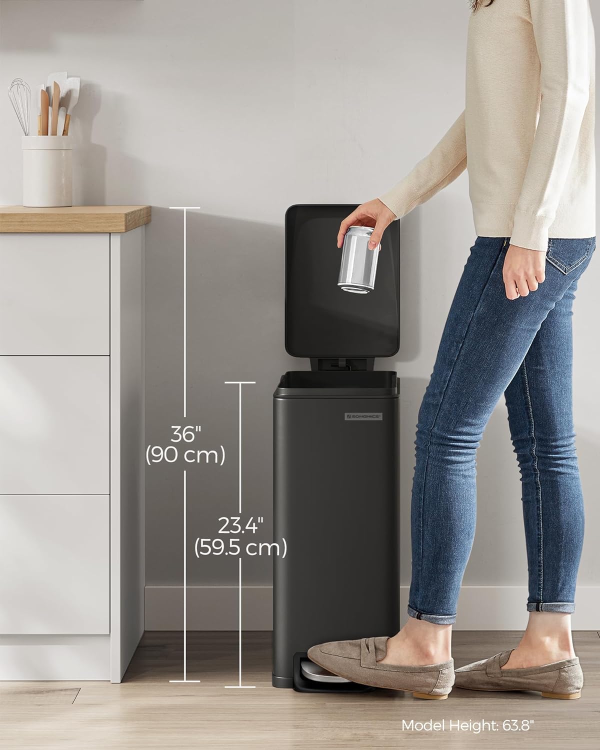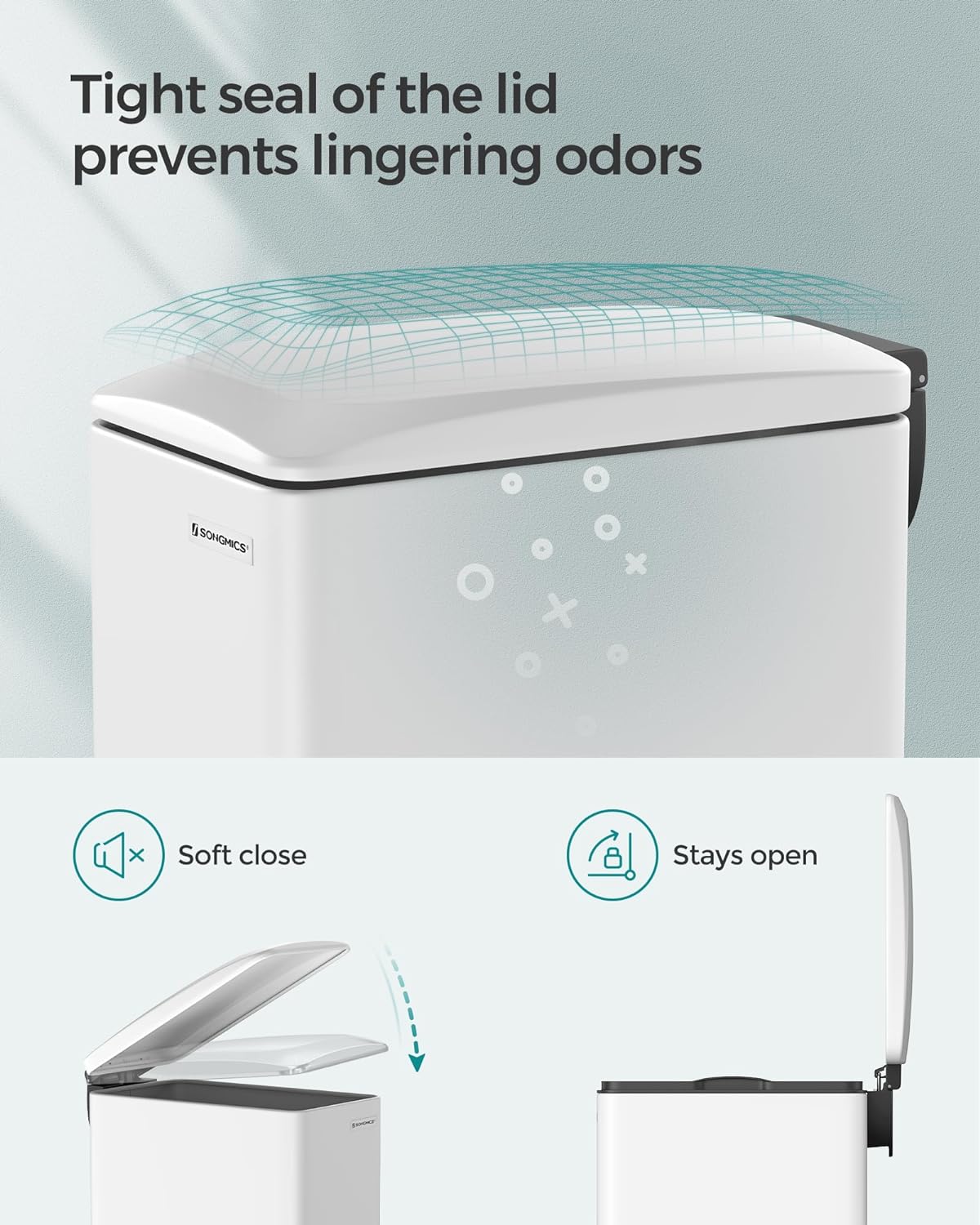 - [Closes Softly & Stays Open] This garbage can features a silent and soft close lid that can seal stinky smells inside. The lid can be kept open for bigger jobs by using your hand to open the lid to a catch point
