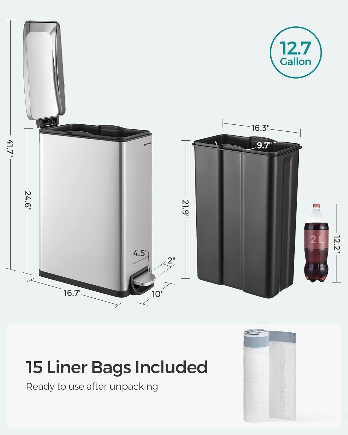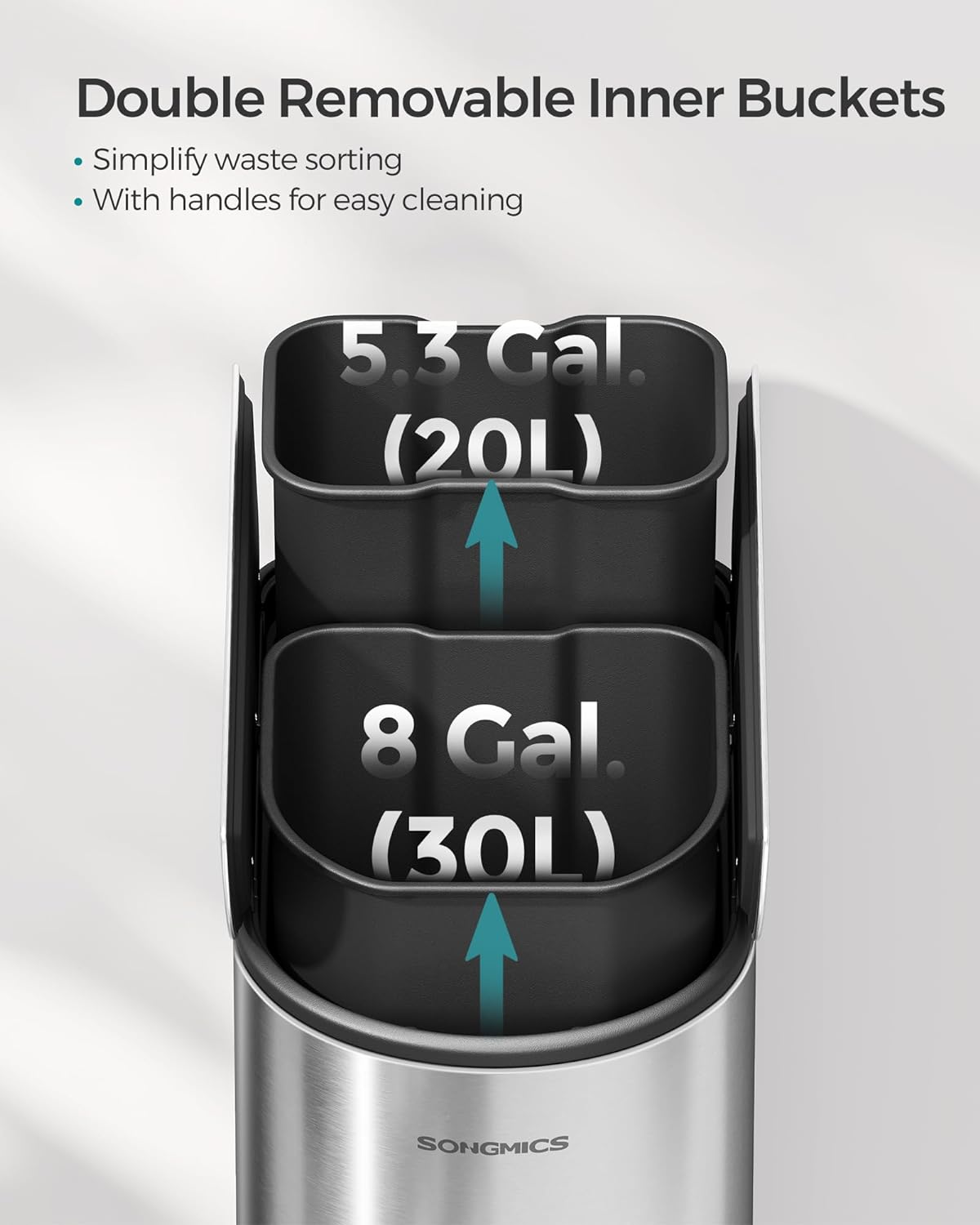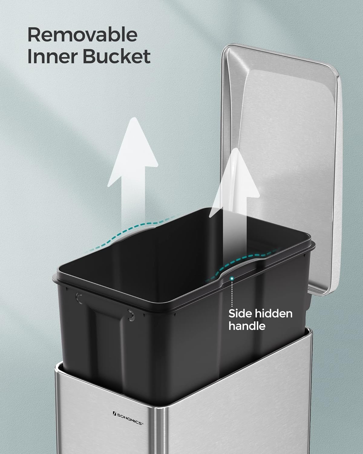 - [Handy Inner Bucket] Lift the removable inner bucket out with the built-in handles to easily clean it or change the liners. The bucket also secures the bags in place