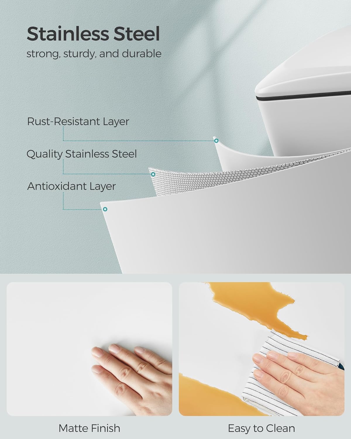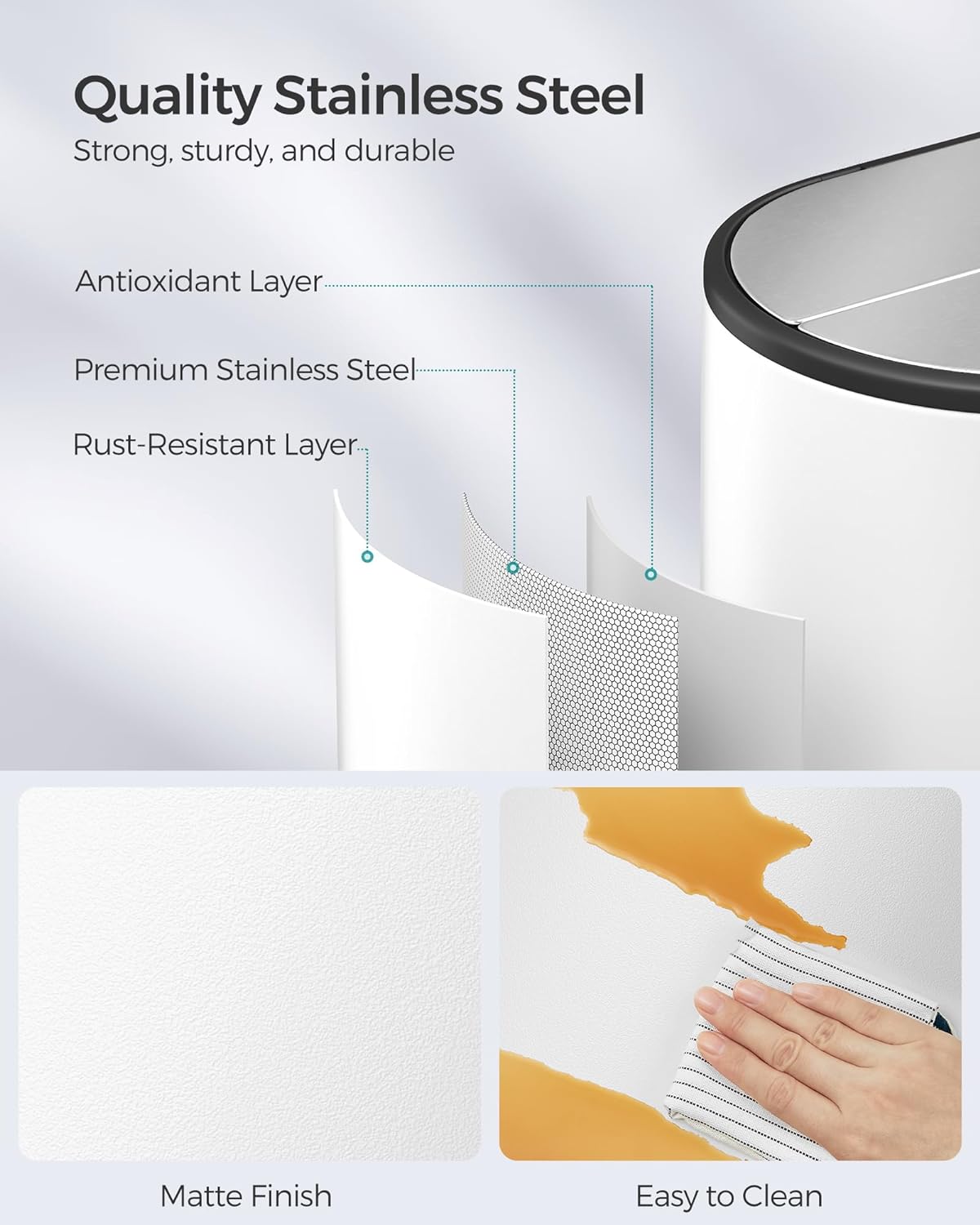 - [Easy Cleaning & Modern Design] This stainless steel trash can is fingerprint-resistant and easy to clean with a damp cloth. This trash bin has a silver sheen with a sleek modern look that easily matches any decor