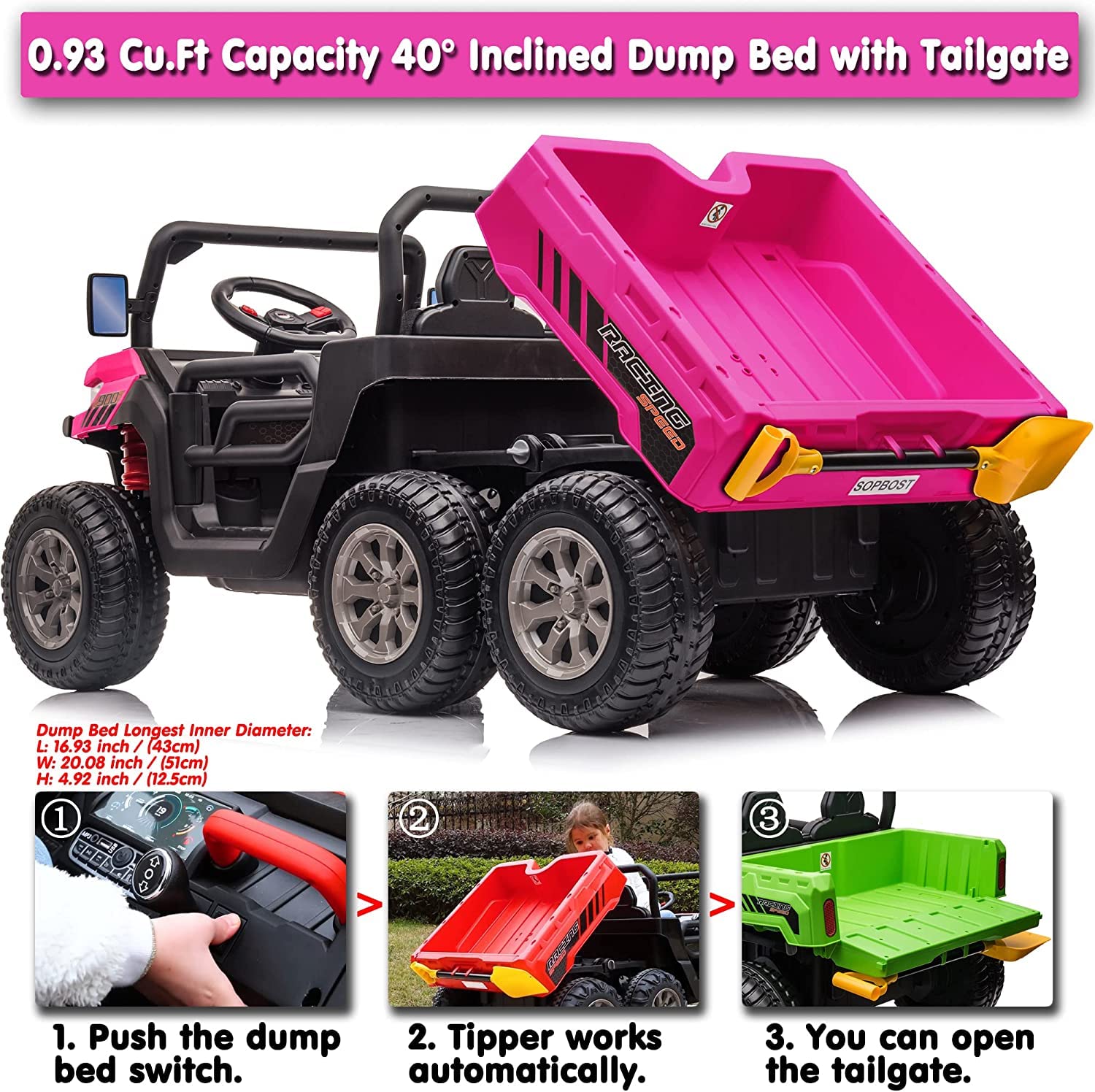 - u3010Kids Truck w/ Electric Dump Bed 0.93 Cu.ft Cargo Boxu3011sopbost ride on truck is equipped with an electric auto lifting dump bed, little driver can control the dump bed via the switch instead of pulling it manually. And this ride on toy car comes with a iron pipe toy shovel and shovel holder at the tailgate, your kids will enjoy a transport experience with this dump truck.