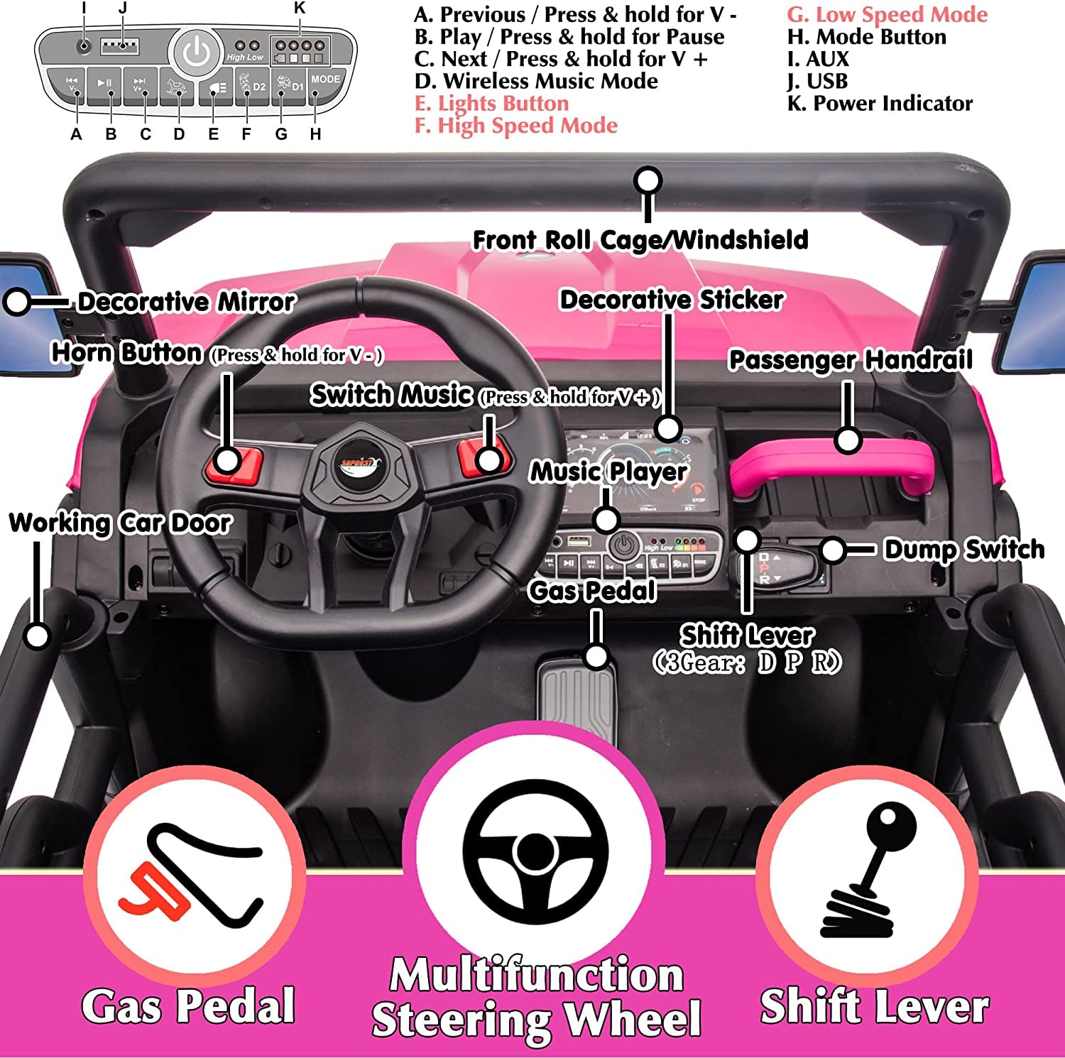 - u3010Kids Ride On Car w/ Parent Remote, Gas Pedal & Shift Leveru3011Easy to start by one button. Kids can drive the truck around freely through the shift lever, the foot pedal and the steering wheel, provide your kids a real driving experience. And the remote control allow parents override the little driver when it is necessary and avoid the accident.