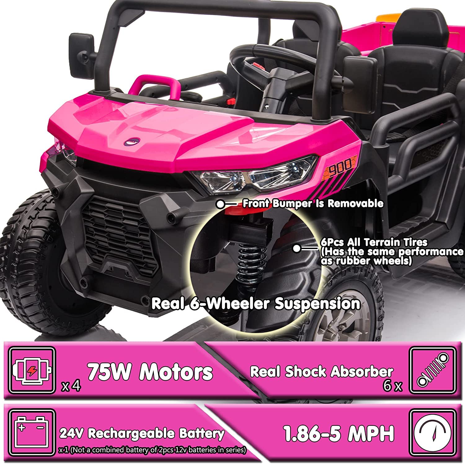 - u30104x75W Motors 24V 4WD 2 Seater Ride On Caru3011This dump truck is powered by a 24V rechargeable battery that is totally not 12V*2 battery in series, but a complete single safe 24 volt battery, and driven by 4pcs #550 75W motors. Max speed is up to 5mph. 20 Inch wide 2-seater is for 2 little kids or 1 to play together. The powerful motors and all terrain EVA tires that is the same performance as rubber tires make it easily to ride on different terrains, provide your kids a enjoyable driving trip.