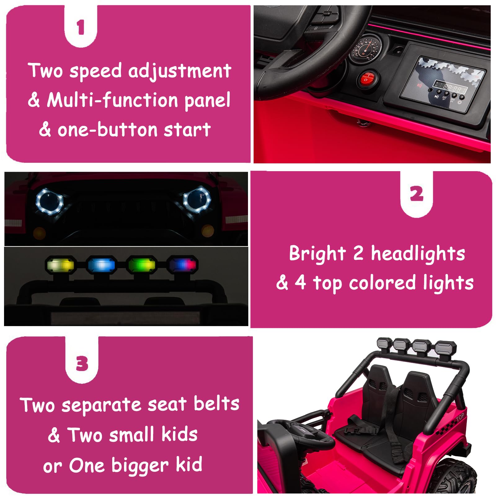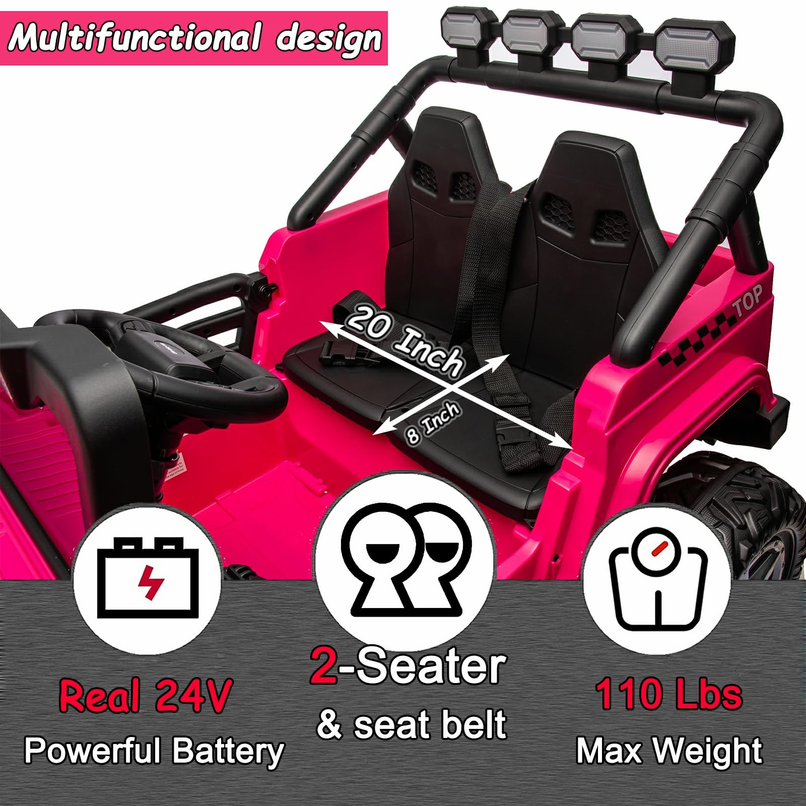 - ud83cudf81u3010Funny Driving Experienceu3011This 24V electric car equipped with bright LED headlights & taillight, AUX port, horn and music for extra driving fun. Designed with wider seat with safety seat belts, 2 lockable doors can provide your kids with safety driving experience.