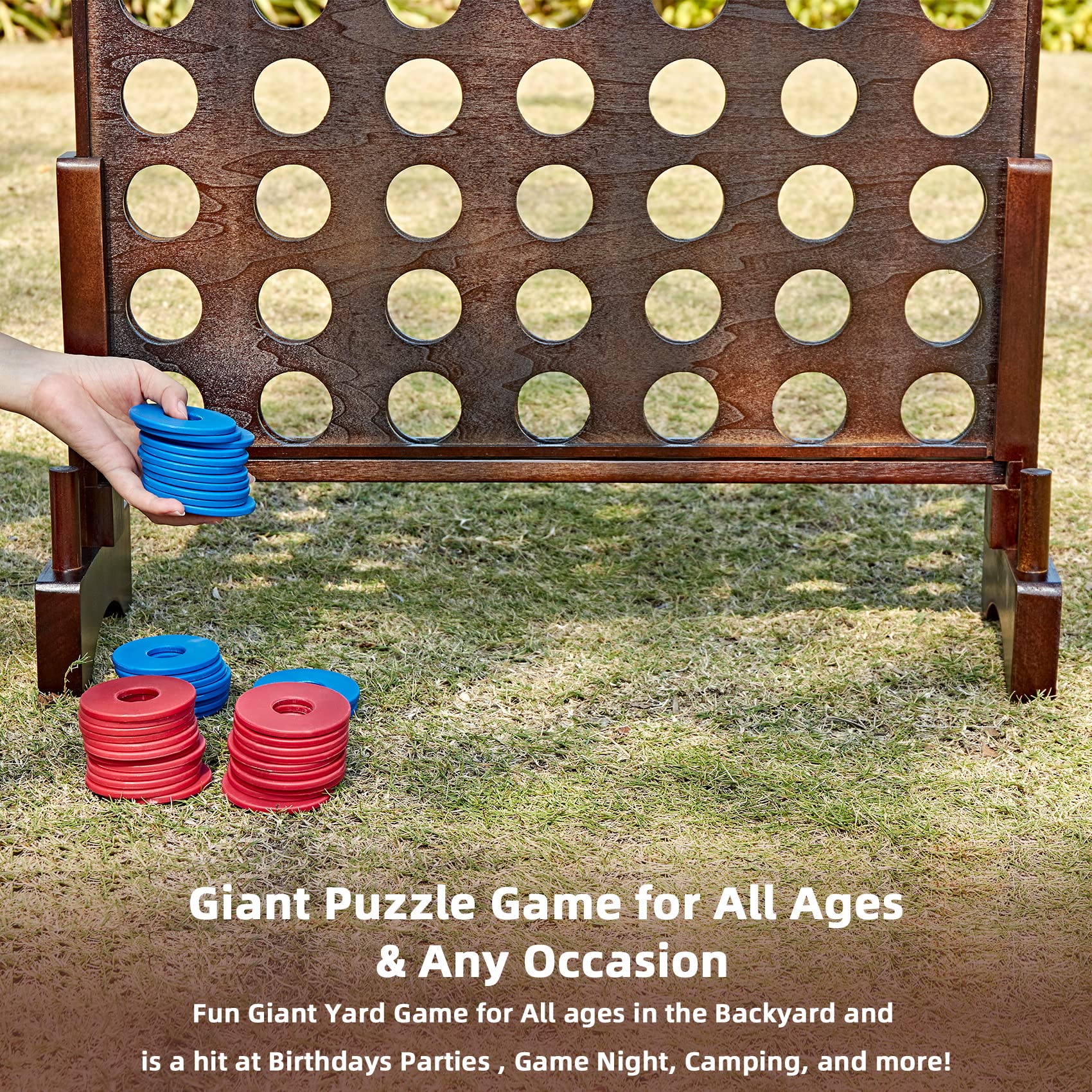- The four in a row board is very well-made which will not stuck the chips during playing. Theu00a04-to-score giant games measures of u00a026u201d tall and 22u201d width after assembly which is the perfect size for both indoor & outdoor activities