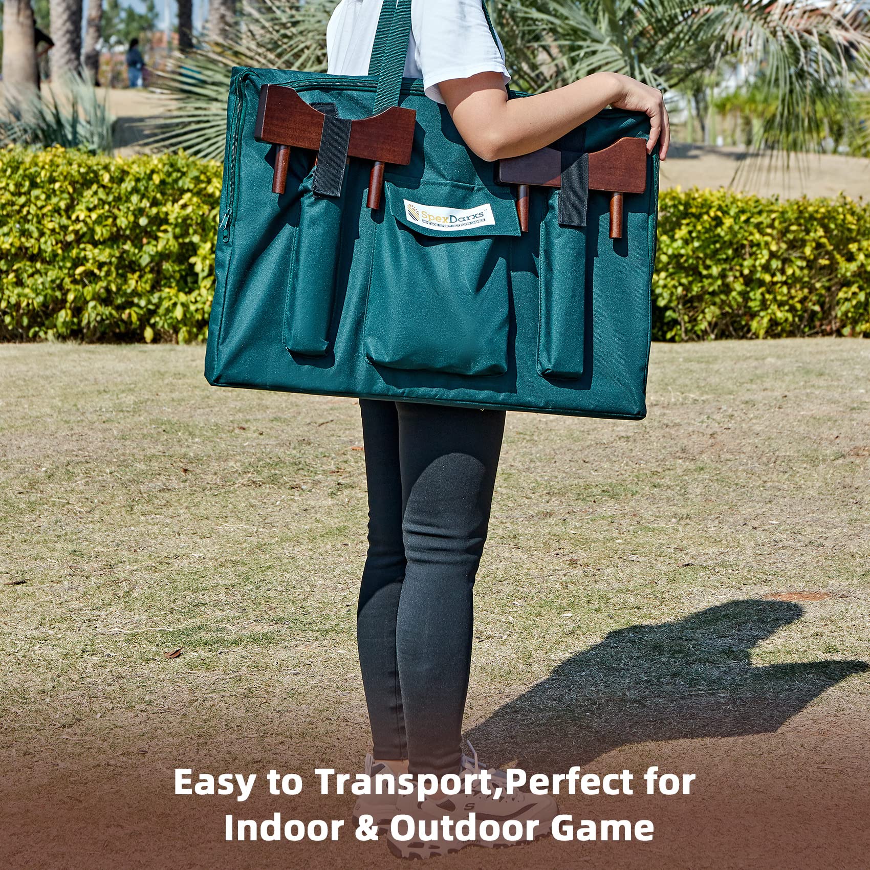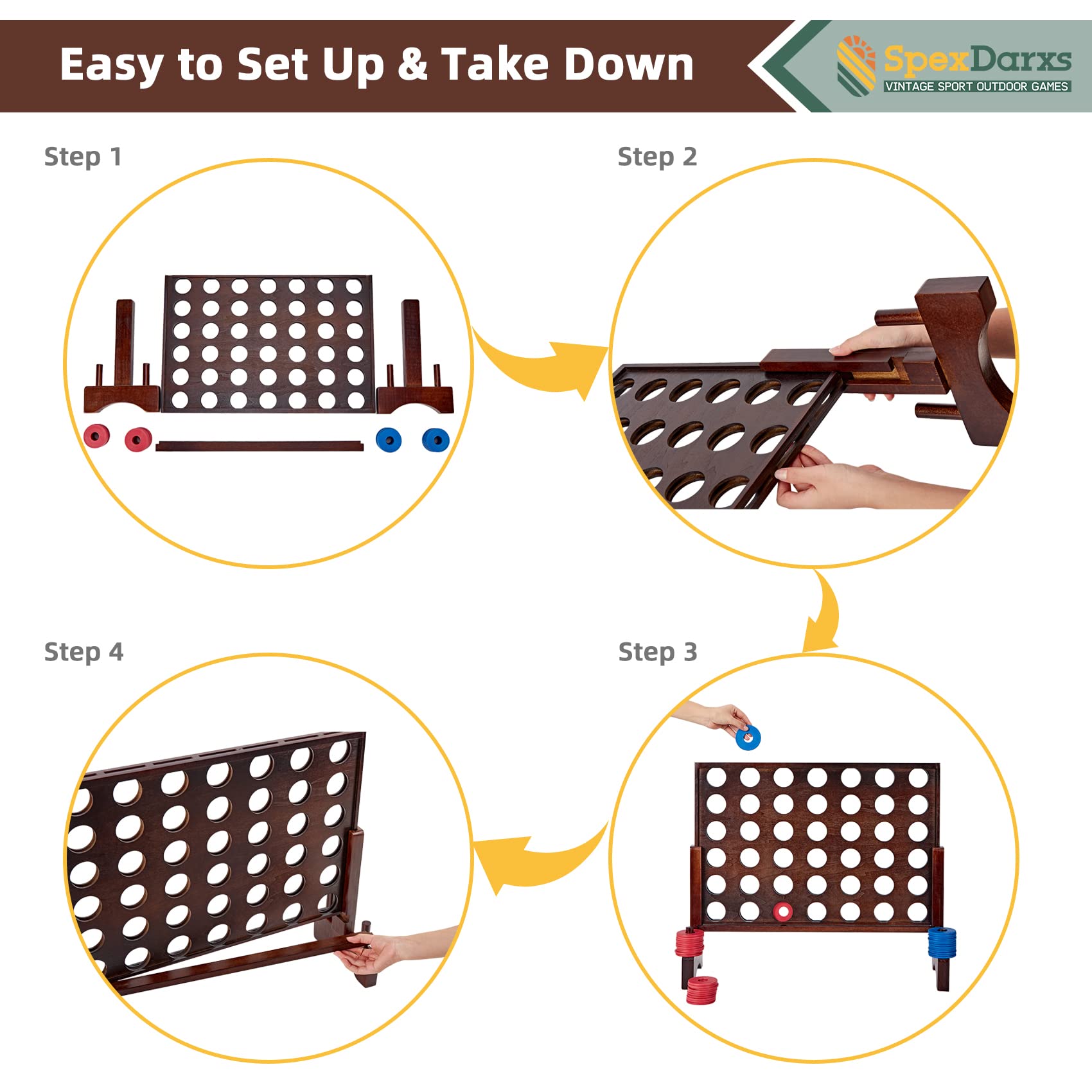 - SpexDarxs giant 4 in a row game comes with 1PCS pinewood board, 2PCS removable wooden legs, 42PCS plastic chips, 1PCS carrying bag. Just take minutes to set up the board game set can bring you endless entertainment.