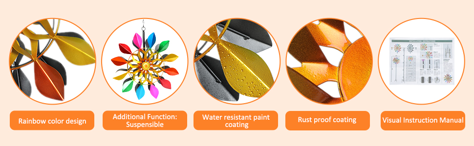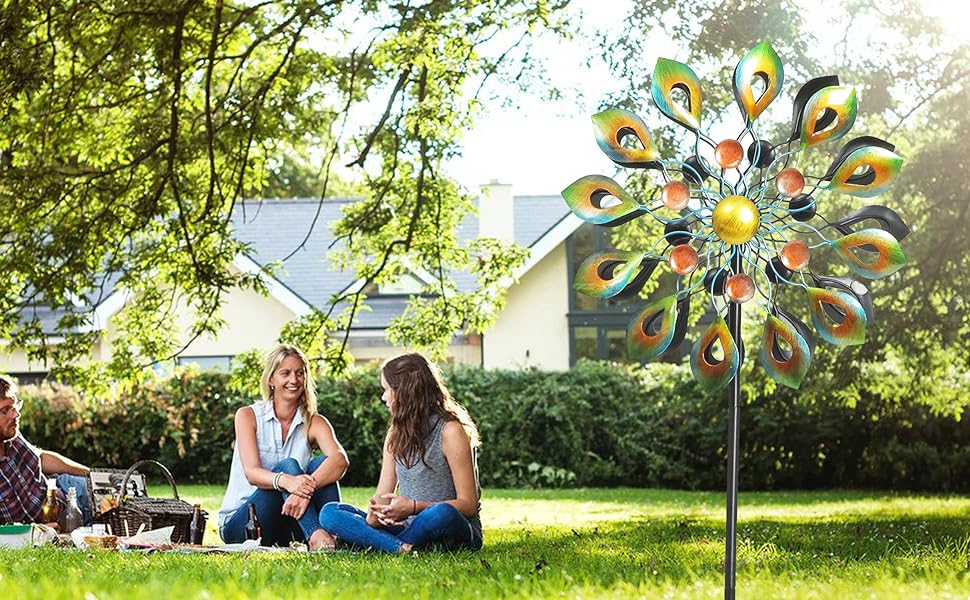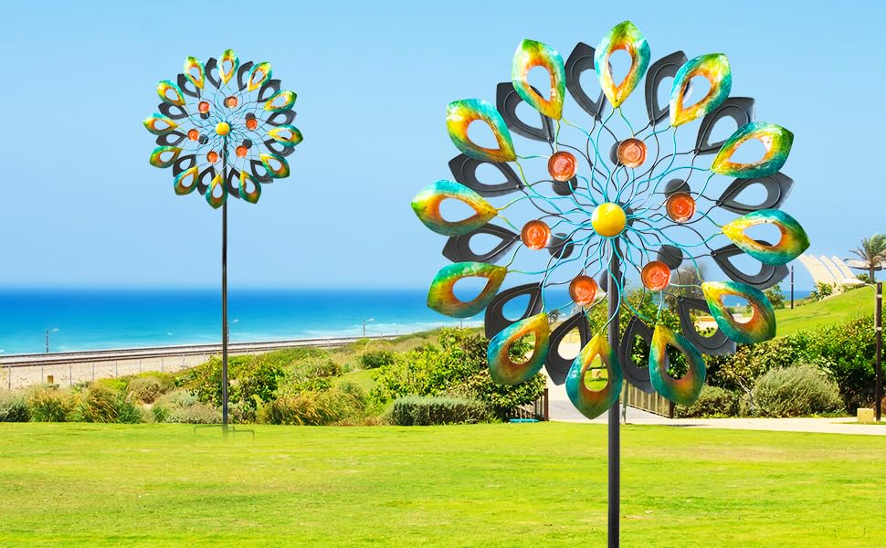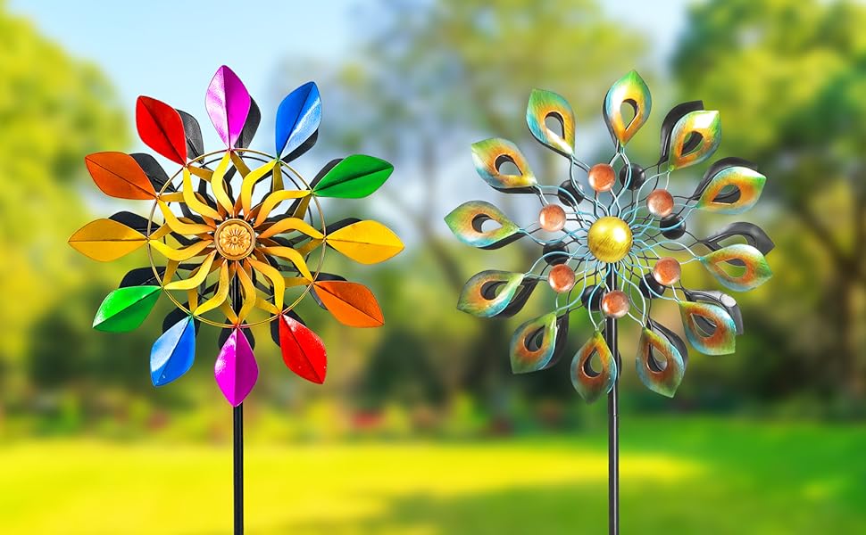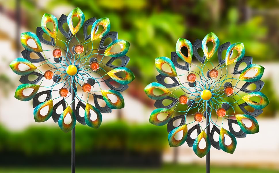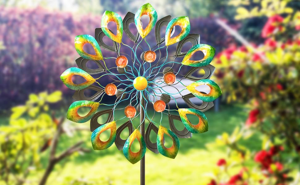 • [Ingenious garden spinners decorations] - The delicate animal peacock tail style inspires the wind sculptures & spinners, which made of durable metal and bright paint, creates a visual sensation in the garden. The unique style blade combined four colors to make it seems more richer. Suitable decorate your garden and patio.