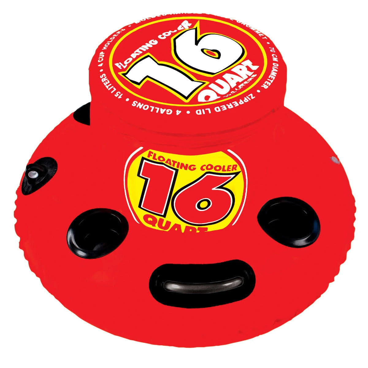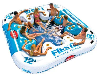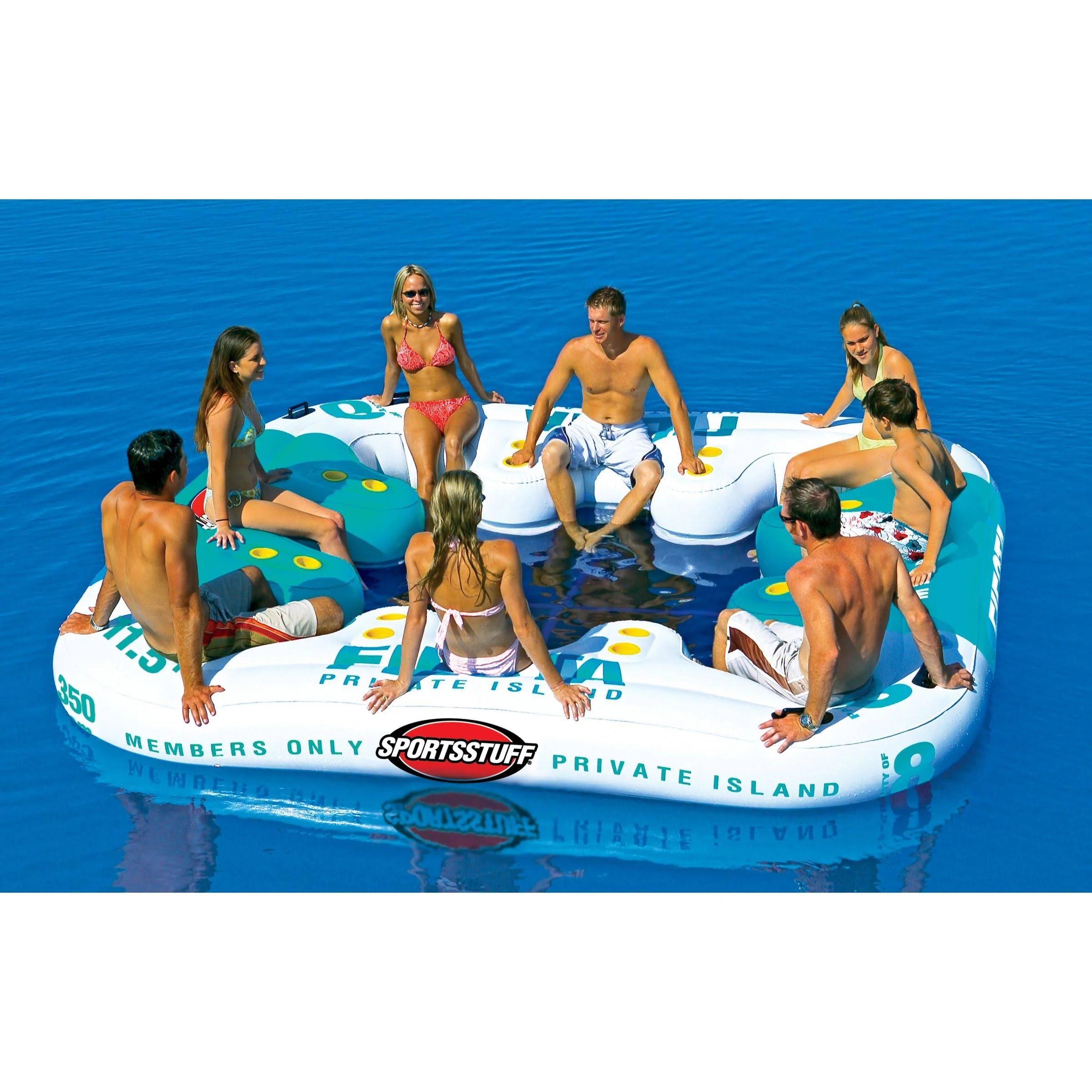 SportsStuff 路 Floating Island 路 8 person The SportsStuff Fiesta Private Island can hold between one and eight people. This island features molded PVC cup holders that surround the edge of the unit. Sit on the mesh bottom while reclining against the contoured backrests and water will filter in through the bottom to keep you cool while you are relaxing. You may also sit on the floating platform portion and let your legs hang over the side. This SportsStuff Fiesta Island in white and turquoise includes a speed safety valve for fast inflation and deflation. The anchor system will keep the island in place so that you do not float away. Molded handles make the island easy to transport in and out of the water. The floating 16-qt cooler with cup holders is attached to the island's grommet system and will provide a place to keep cold drinks. The SportsStuff Fiesta Private Island is suitable to use on lakes or other large bodies of calm water. The unit deflates for convenient storage when not in use.