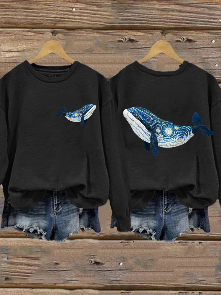Starry Night Inspired Whale Embroidery Art Washed Sweatshirt