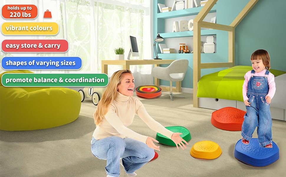 - ud83dudd34u3010MORE FUN WITH COLOURu3011Our kids body coordination training kit consists of 5 packs stepping stones for kids for kids ages 3+. With bright, vibrant colours and shapes of varying sizes, the playground equipment allow children to have fun and develop their colour and graphic perception while improving their balance and coordination.