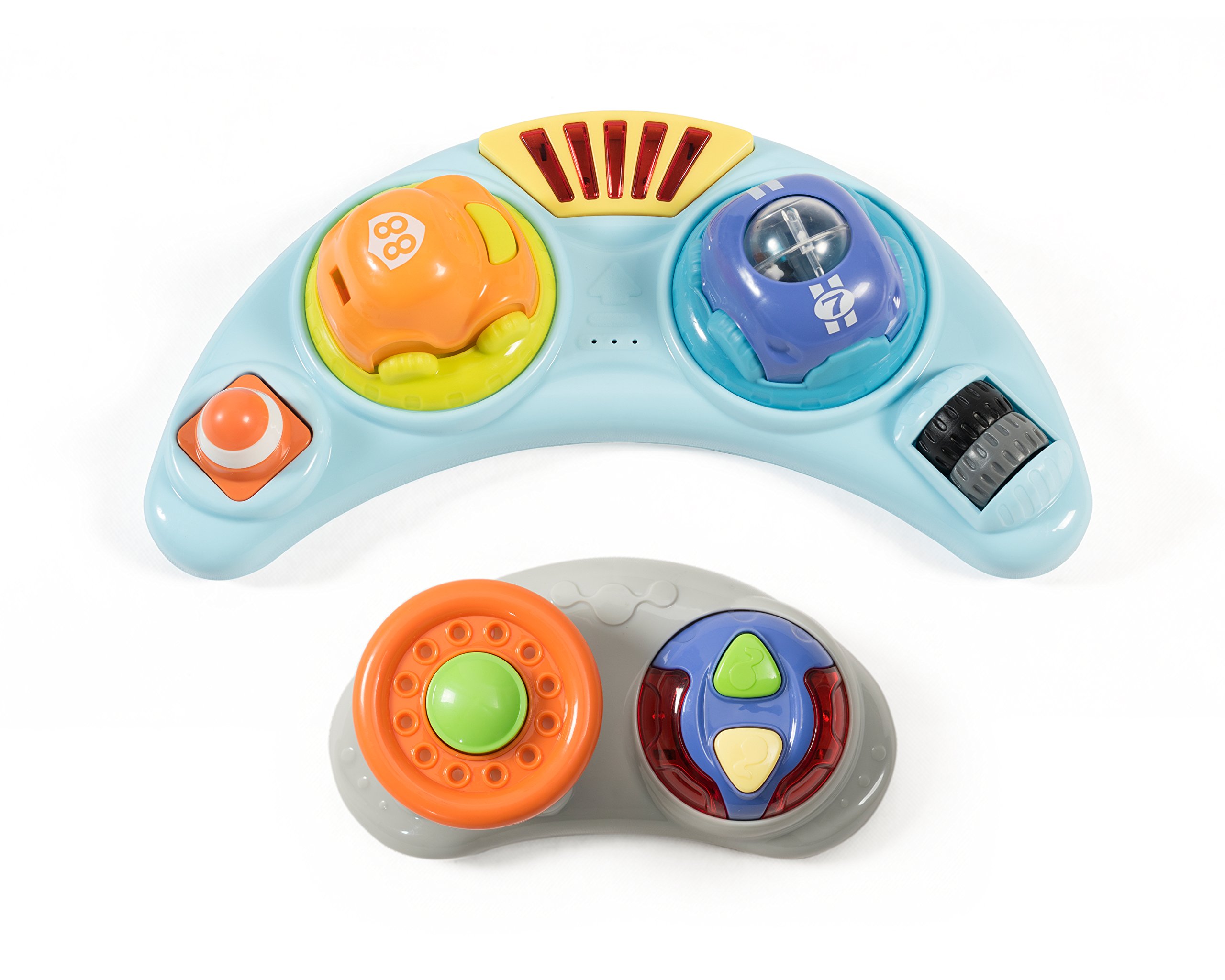 - INTERACTIVE TOY TRAY: The removable toy trays include an interactive steering wheel, ice cream cone, lollipop teether, plus cars & buttons with sounds. Made of Plastic components, polyester fabric