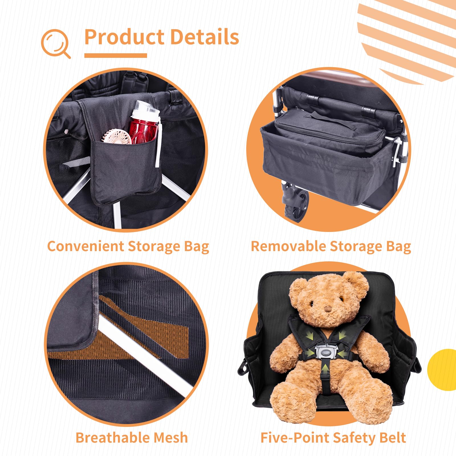 - u3010Unique Designu3011The seat of this wagon stroller for kids is designed with a high chair, the child sits inside the bucket more spacious and better view. Each seat provides a five-point safety belt, the child sits more safely. The canopy is adjustable and removable, providing multi-faceted shade for your kids and your belongings. The side mesh design is more ventilated and breathable, and there are also multiple storage pockets on the back and side for more storage space.