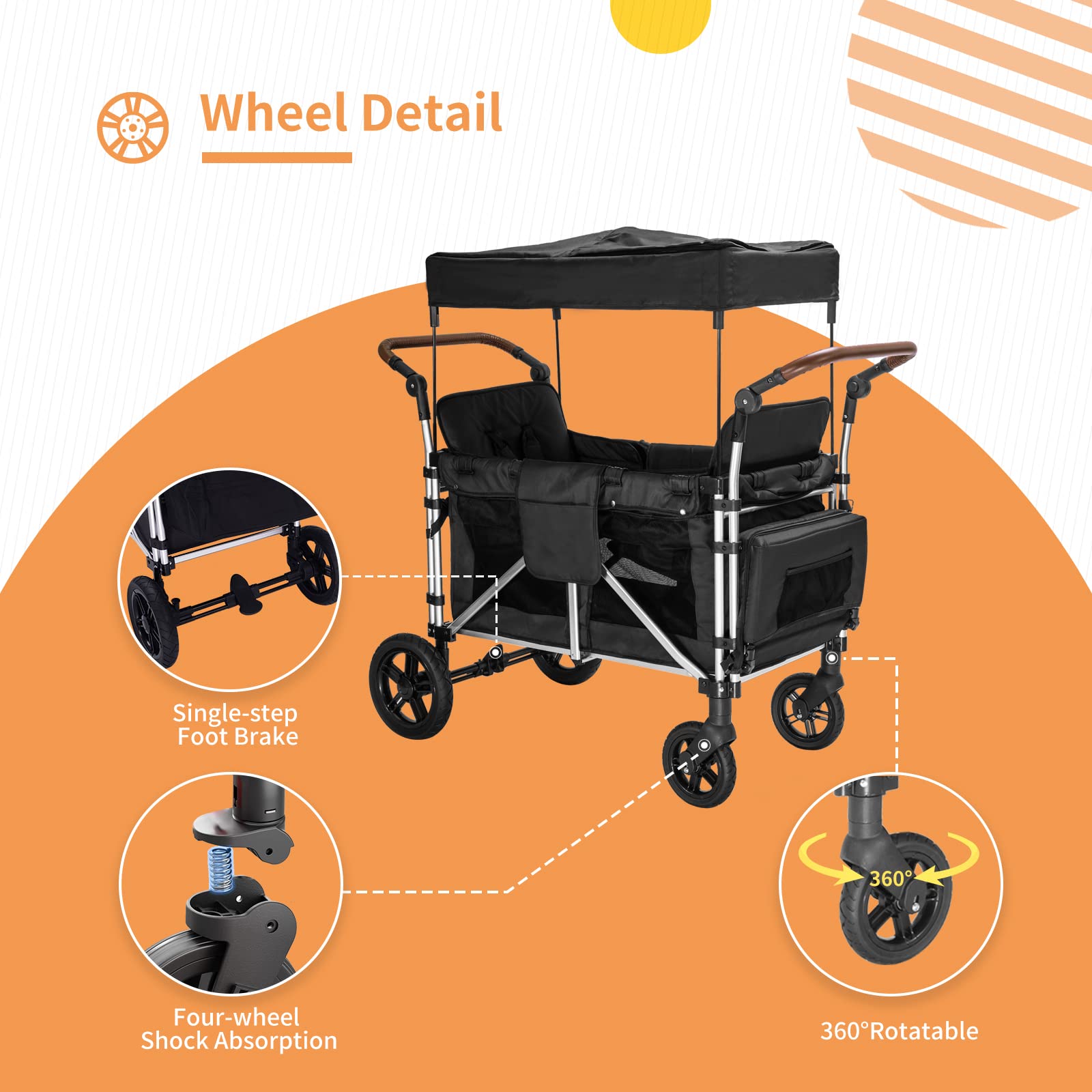 - u3010Safety Brake Systemu3011Our kids wagon uses a single-step foot brake mode, which is more responsive and sensitive when braking. Rear wheel 11 inches, 360 degrees rotatable movement, use to steer more flexible.