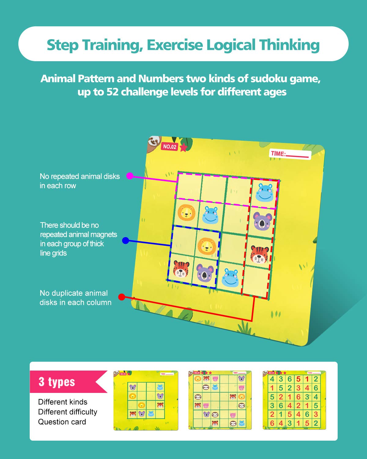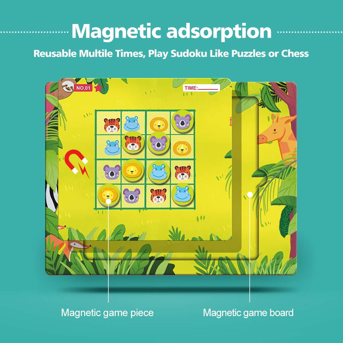 - u3010Anials & Numbers Double Playu3011: Yarloo Magnetic Sudoku bring more fun for Sudoku games, because if only numbers Sudoku will be easily tired. You can play it in animal Sudoku mode, it with 6 kinds of cute animal patterns: Lion, Tiger, Hippo, Bear, Koala, Bradypod; you also can play it in number mode, both up to 52 challenge levels, especially bring more fun for kids.