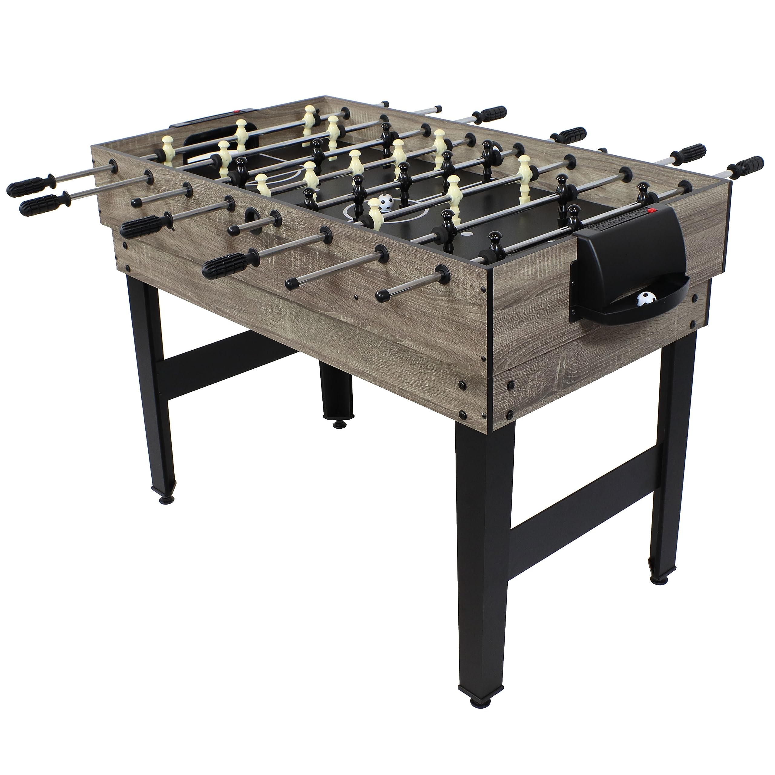 - Compact size: The billiard table measures 41.5" W x 23" D x 26.75" H overall and has a playing area of 38.5" W x 19.75" D x 1.25" H. The foosball table measures 49.5" W with scorers (42.5" W without scorers) x 24" D without rods (40.75" D with rods) x 6.5" H and sits 32" off the ground. The foosball playing area is 41.5" W x 23" D x 3.75" H. The push hockey/ping pong top measures 37" W x 19.5" D x 1" H. The multi-game top is 31.5" W x 15" D x 0.25" thick. This game table weighs 60 lbs.