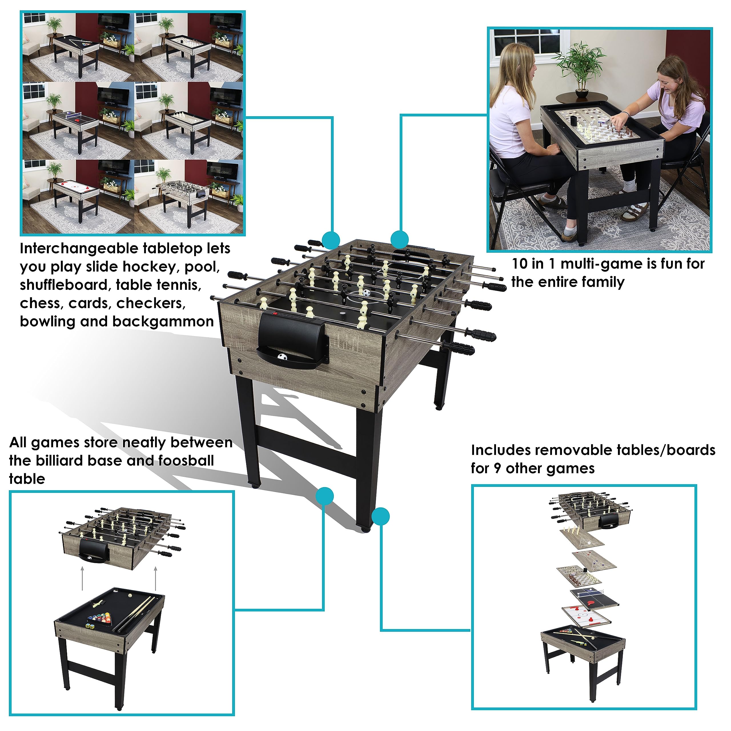 - Provides hours of game play: This convertible game table is equipped with 10 different games to ensure hours of fun. Choose from billiards, foosball, push hockey, table tennis, chess, checkers, backgammon, bowling, shuffleboard, or card games. All accessories for each game are included with the table to begin playing right away.