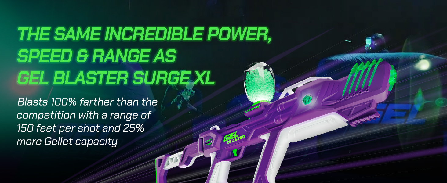 - The Biggest, Baddest Gel Blaster for Day & Night: Starfire XL is the ultimate supersized Gel Blaster powerhouse, now designed to transition easily from day to night! Leave the haters in awe as you blast targets 150 feet away at a blazing speed of up to 250 feet per second. Plus, Surge XLu2019s hopper has a Gellet capacity of more than 1,000, keeping you engaged and your adrenaline pumping around the clock!