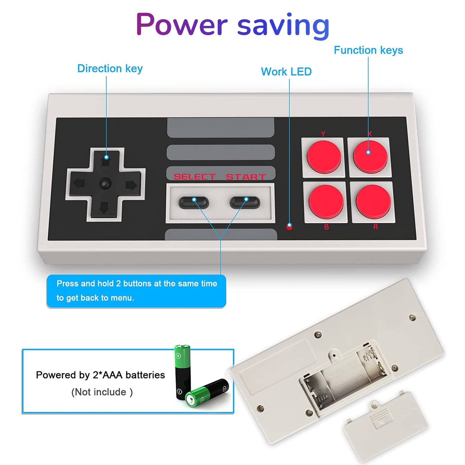 - ud83cudfaeu3010IMPORTANT NOTICEu3011uff1a It's a third-party product, low power 2.4G wireless connections. This handle requires 2*AAA Batteries(Not Included), Put the new battery inside the wireless Controller. No Debugging, Plug And Play.There are some games not English in this mini console. This is an 8-bit game console with simple controls and picture quality will not be as crisp as today's games,and frozen sometimes, But many classic games are still fun and very challenging.