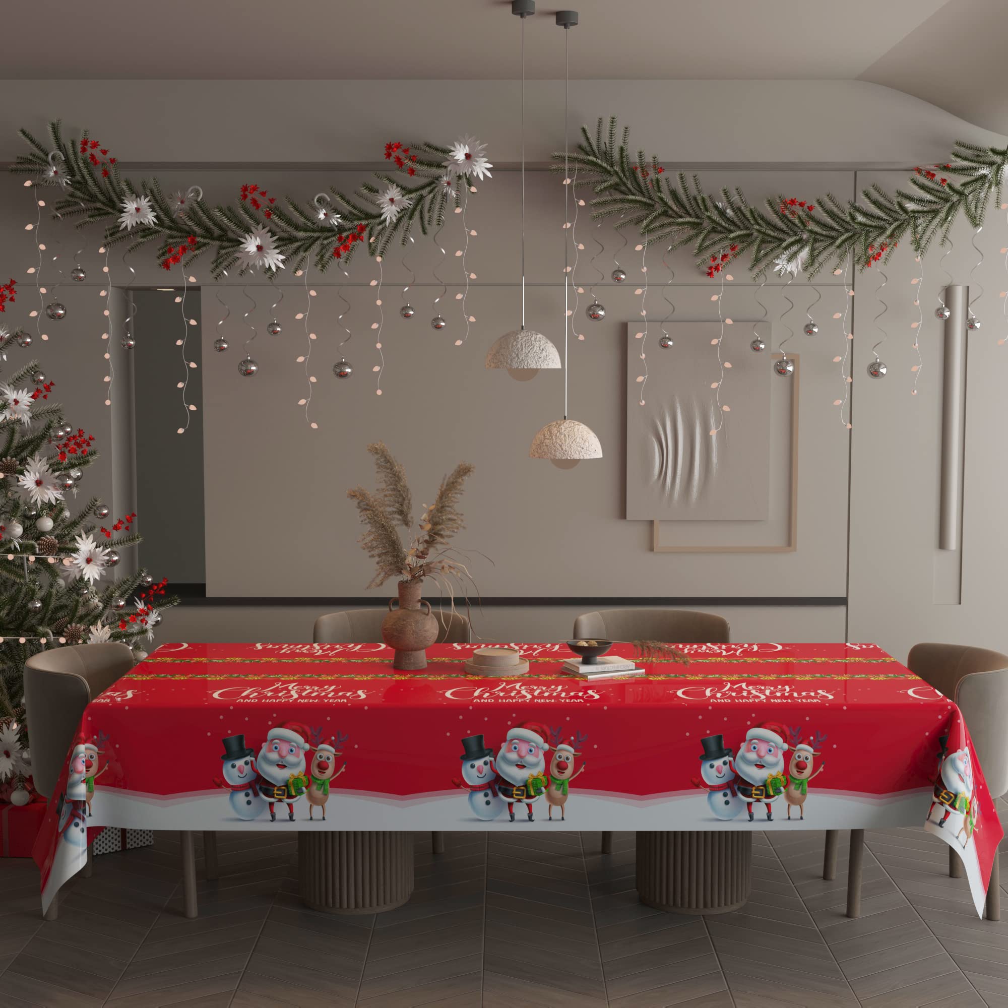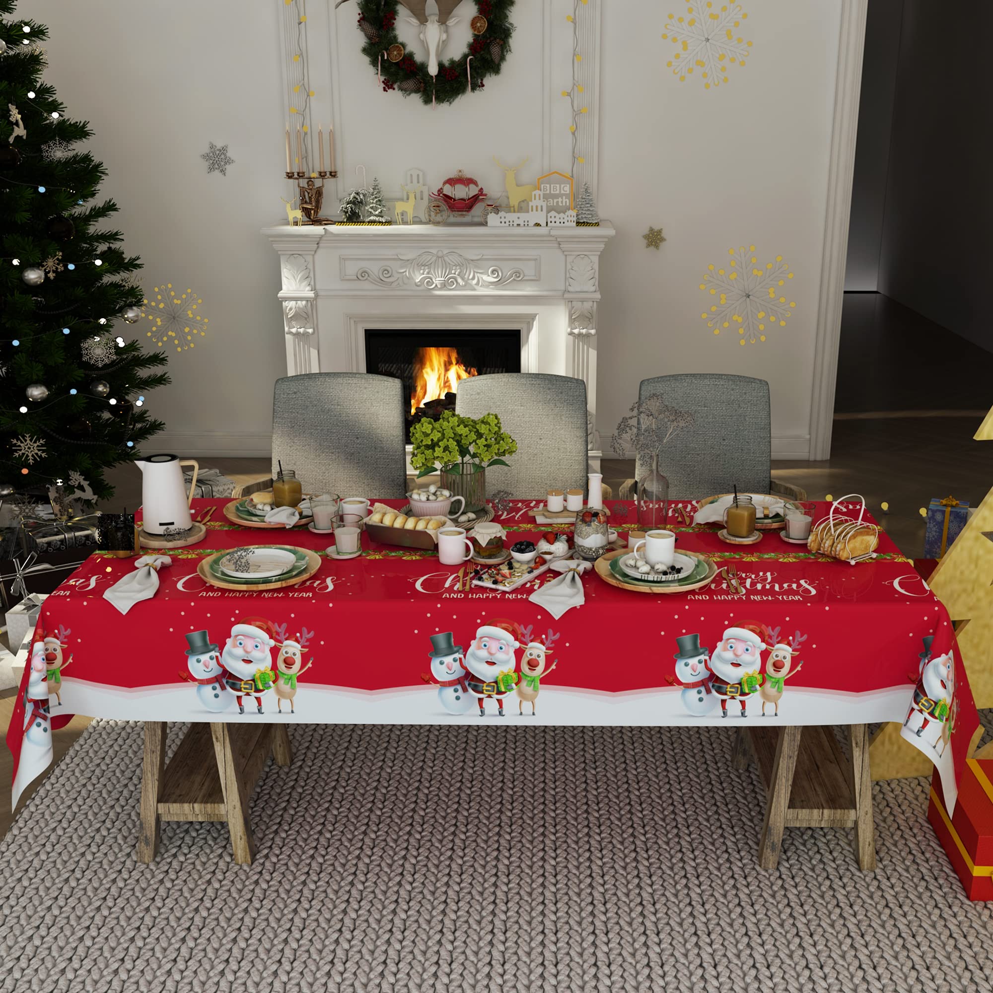 - COOL CHRISTMAS TABLECLOTH DESIGN: Red color of Christmas table cloth. Each Christmas table cover features with Elk, Snow, Snowman and Santa Claus . Itu2019ll add a sparkle to the party. Great plastic tablecloth for New Year/Christmas themed event.