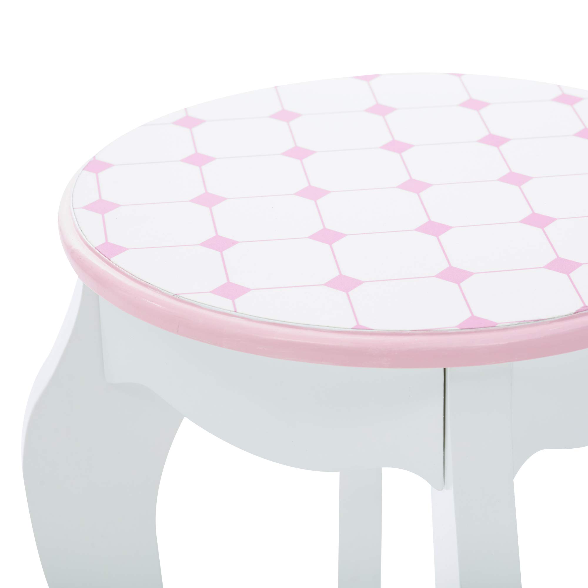 - MATCHING VANITY STOOL: A vanity stool that has the same pattern on the top as the "tile floor" of the vanity's tabletop is included for a complete play experience.