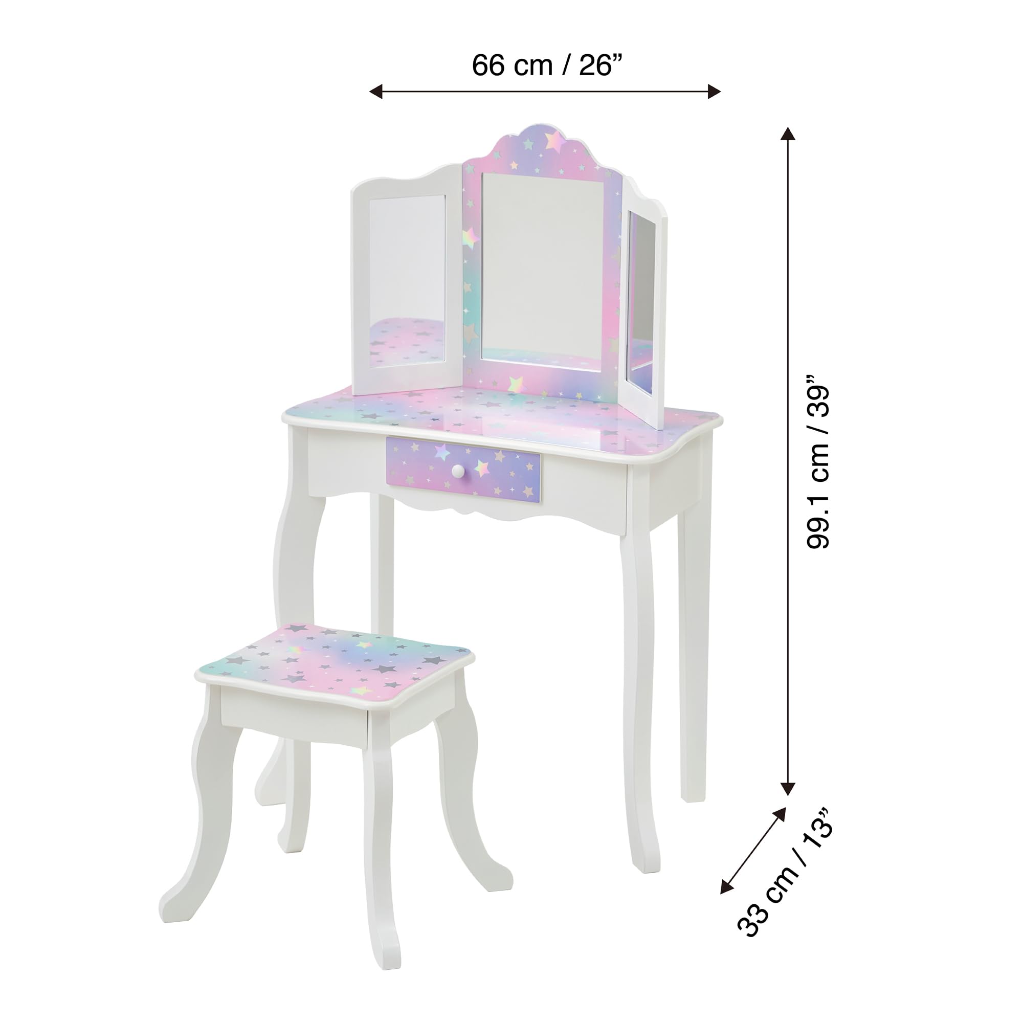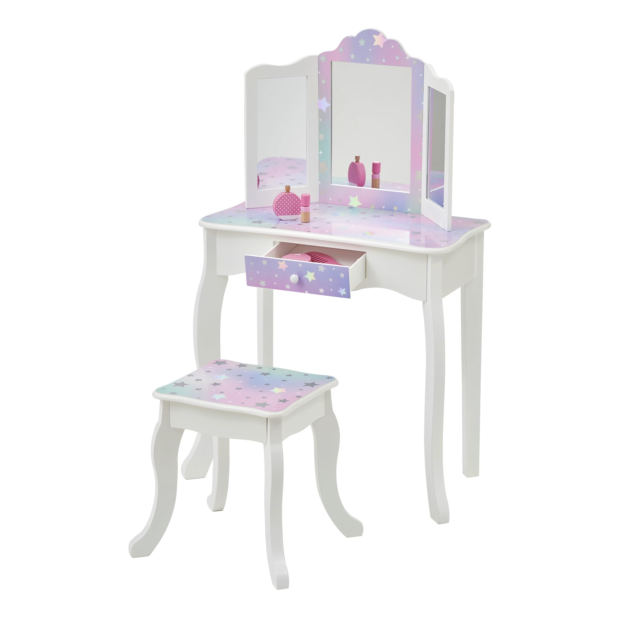 - TIME TO PLAY DRESS UP: Includes a vanity table with a tri-fold mirror (with an acrylic mirror) and a storage drawer for hair accessories, play make-up, jewelry, etc.