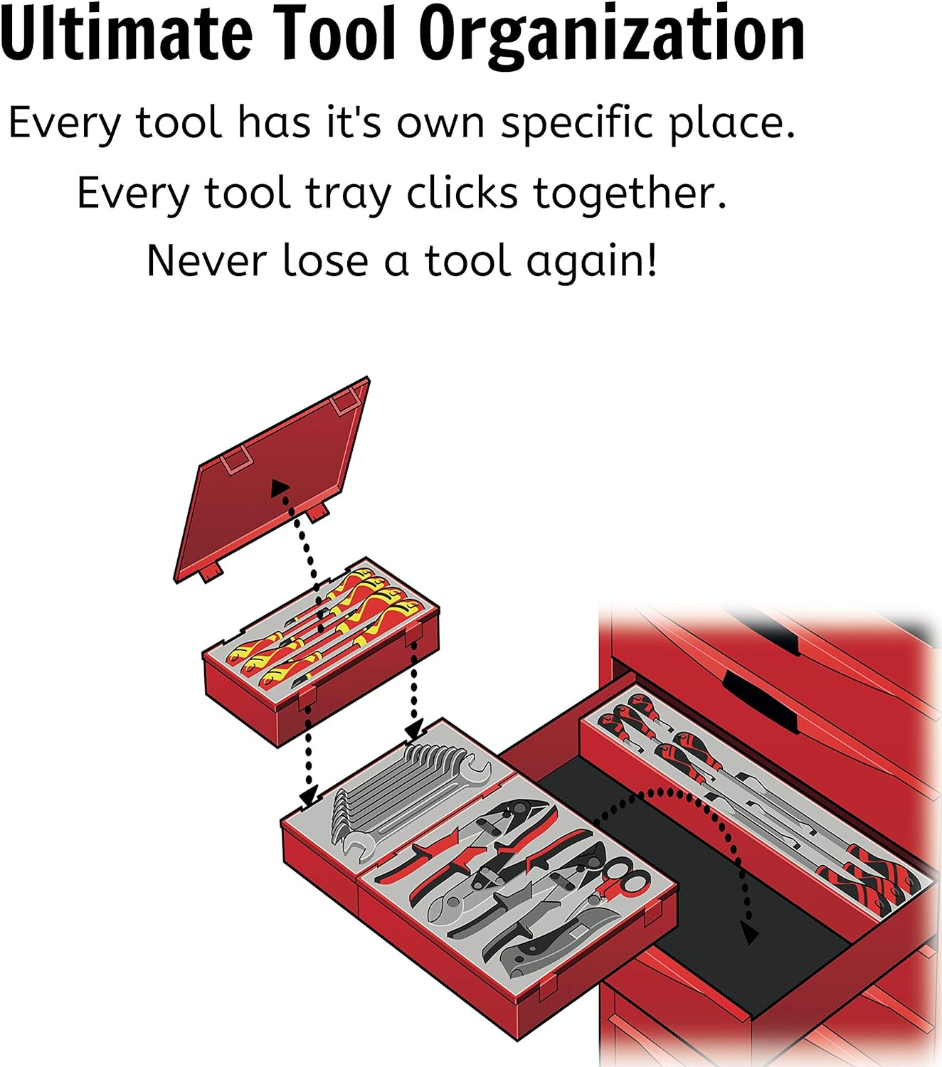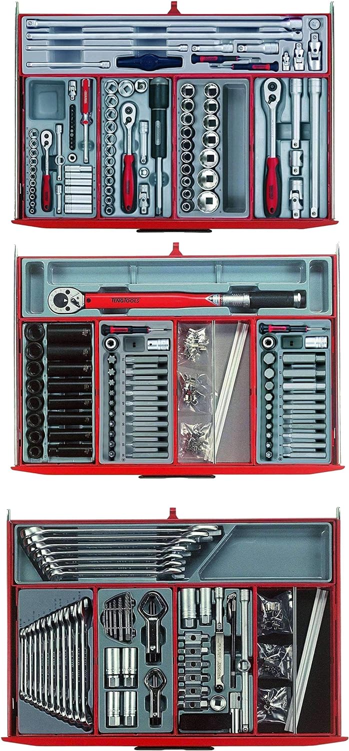 - 87 wrenches/spanners, 135 TX/Hex bits & drivers, 6 empty add on trays, 95 impact tools, 13 extensions, 16 piece mini tool set, 121 piece crimping pliers set