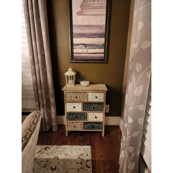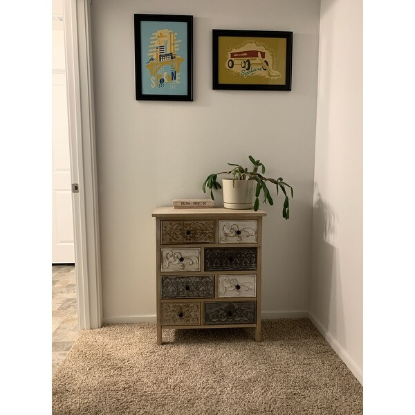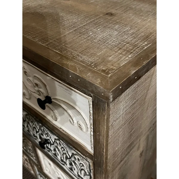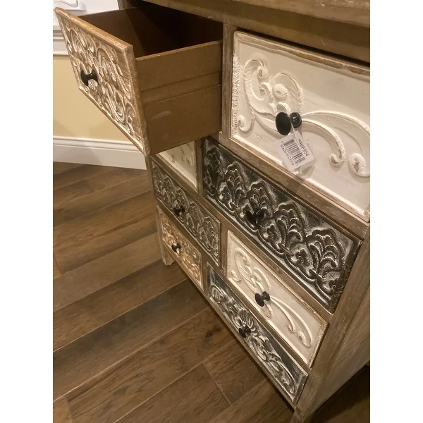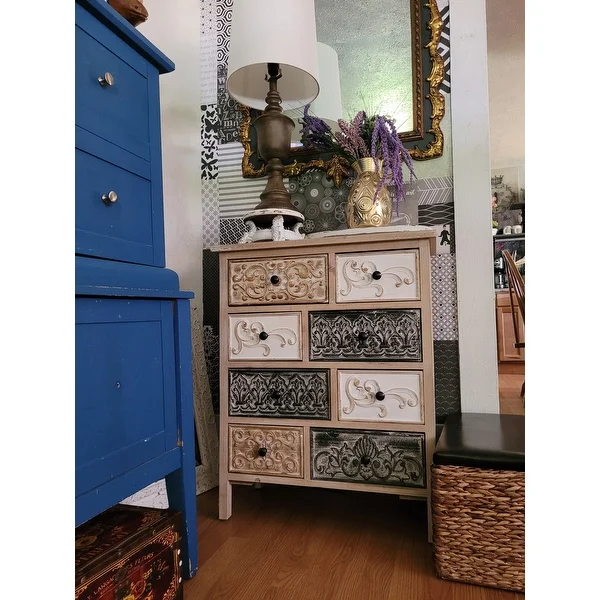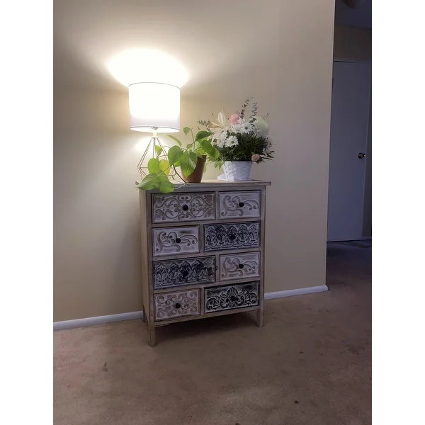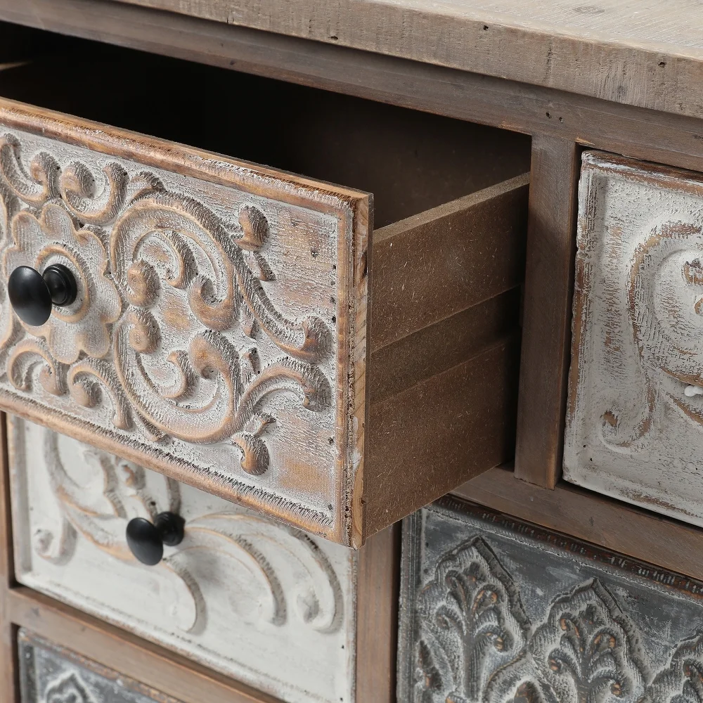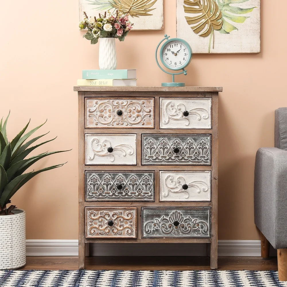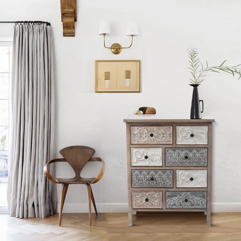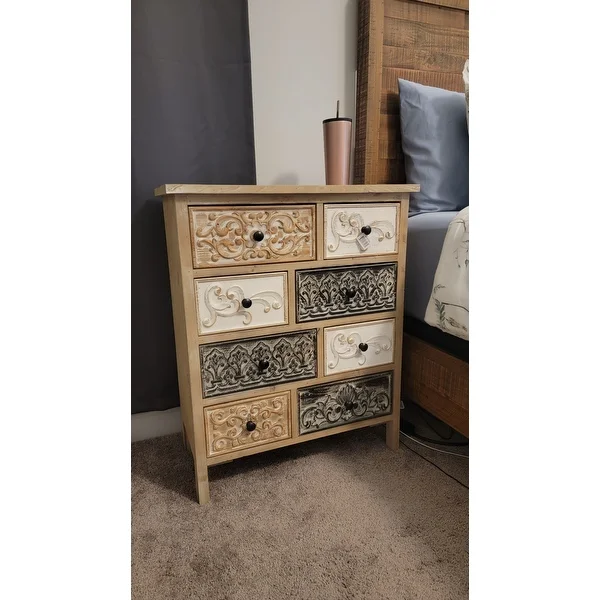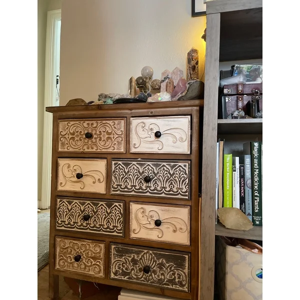 Add a rustic farmhouse charm to your home decor with The Curated Nomad Brewa Varied Rustic Carved Wood 8-Drawer Chest.