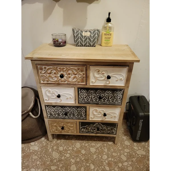 Add a rustic farmhouse charm to your home decor with The Curated Nomad Brewa Varied Rustic Carved Wood 8-Drawer Chest.