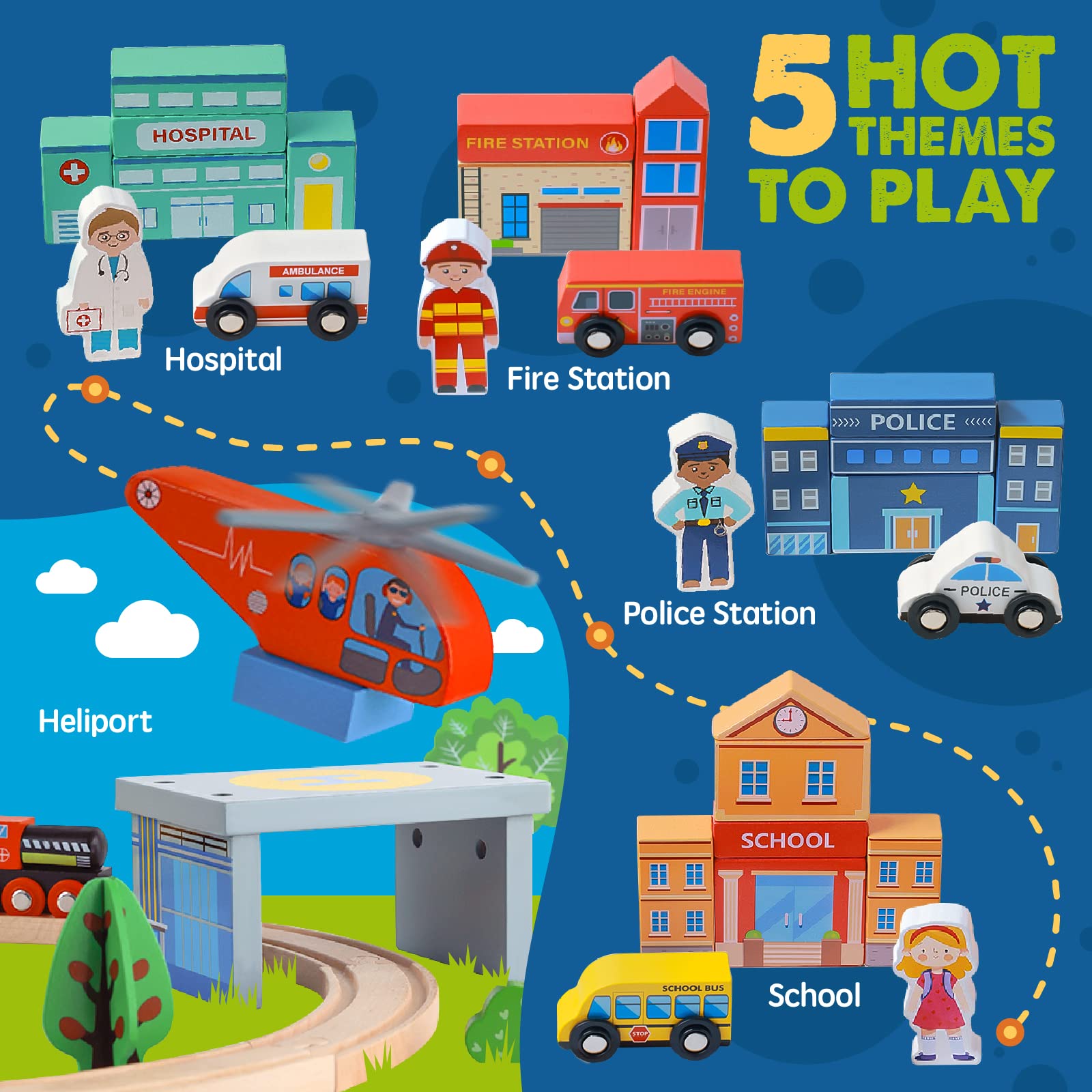 - ud83dudd14u3010Use Blocks To Create Your Own Townu3011Hot themes to play: hospital, fire station, police station, school and heliport. Rich scenario building blocks and matching character accessories are conducive to stimulate creativity and imagination! We believe that our wooden train set can promote logical thinking, problem solving, creative thinking, hand-eye coordination and fine motor skill development of your little one.