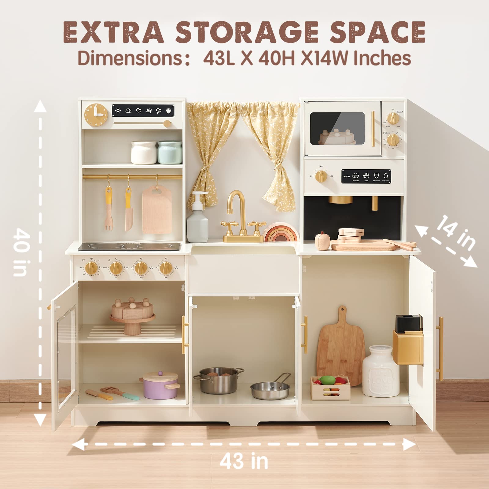 - ud83cudf08Plenty of Play Features: Wooden play kitchen is equipped with an ice maker, coffee maker, microwave, stove, faucet, and sink. It also comes with a clock, weather table, oven, and cupboards. Rich configuration can enhance children's coordination and imagination.