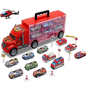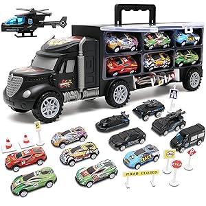 - u3010Abundant Die-Cast Kids Toddler Toysu3011This car toys for 3 4 5 6 7 year old boys comes with 12 car slots for storage and a snap-close lid ensuring the 6 mini police cars, 6 small racing car toys and 8 PCS traffic signs are inside, double-side visible lid display all the kids trucks. Kids will love this 20-in-1 set of transport car carrier set